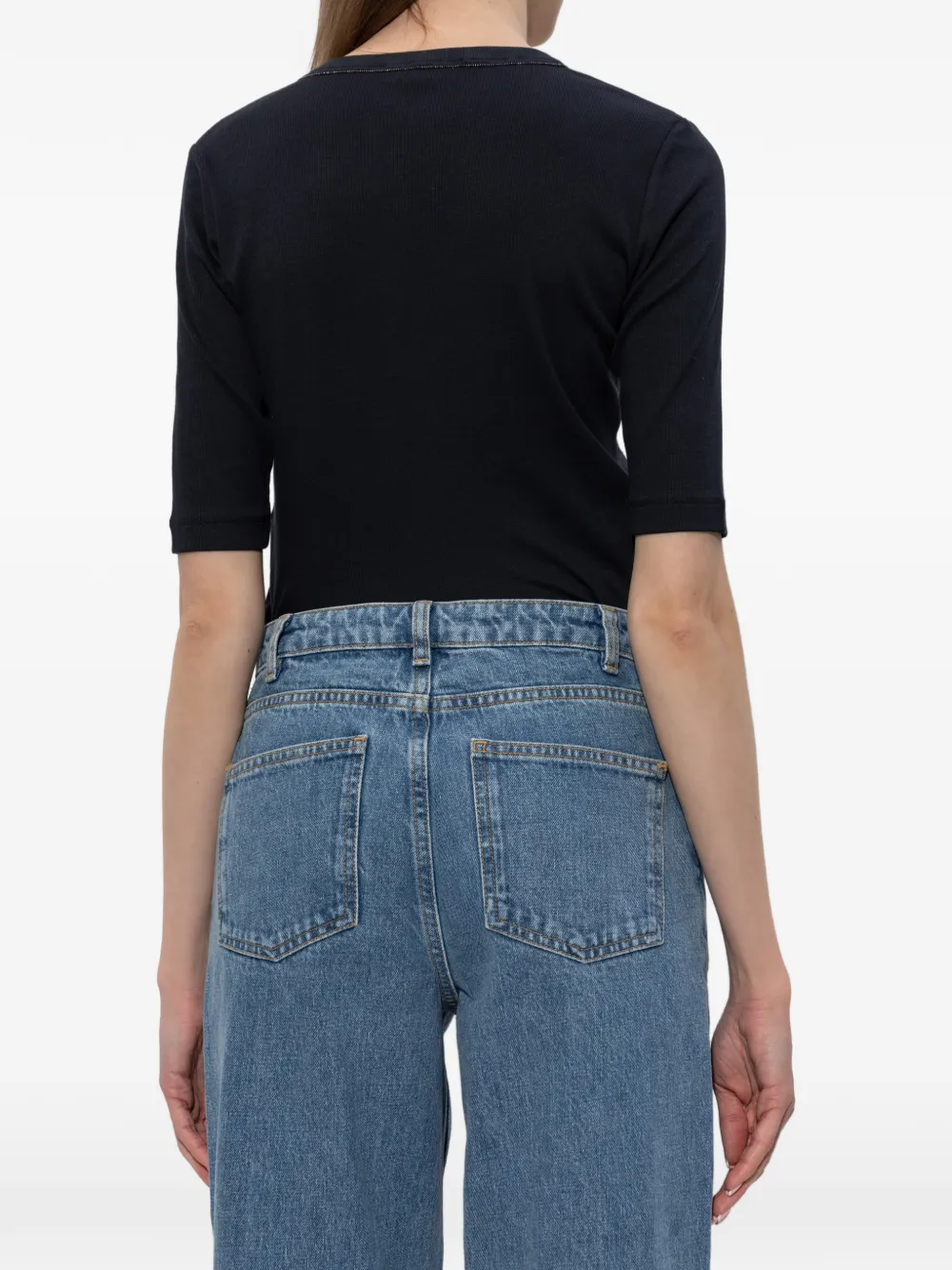 Черный вязаный топ в рубчик с круглым вырезом и рукавами до локтя