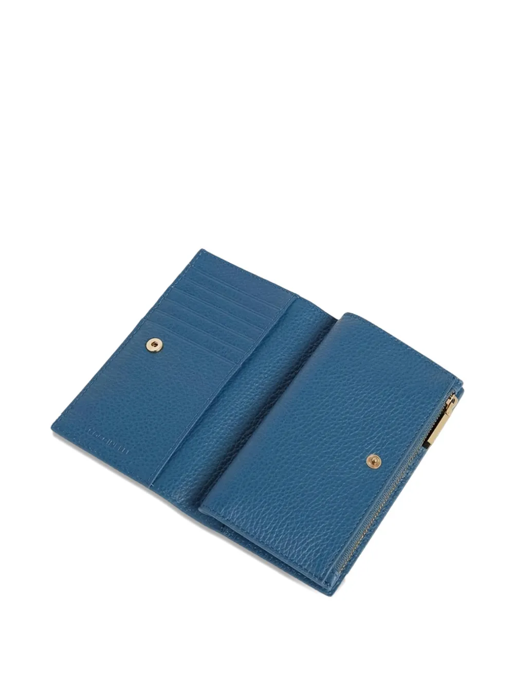 Синяя зернистая кожа, фурнитура золотистого оттенка, нашивка с логотипом, отделения для карт, застежка на кнопку