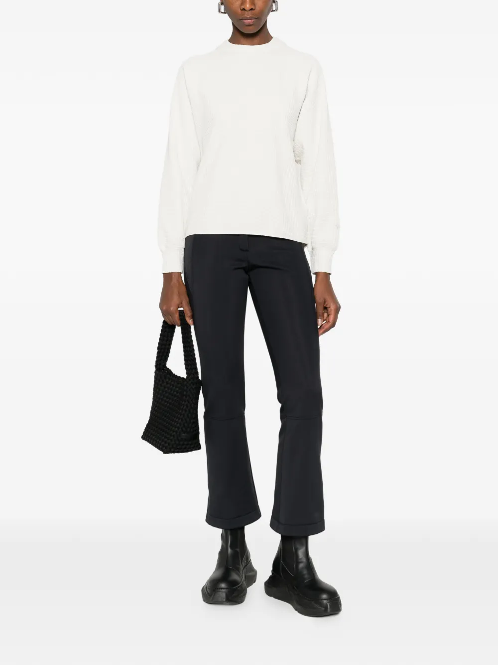 Слоново-косточного цвета, свободного кроя, с длинными рукавами, широкими манжетами и высоким воротом