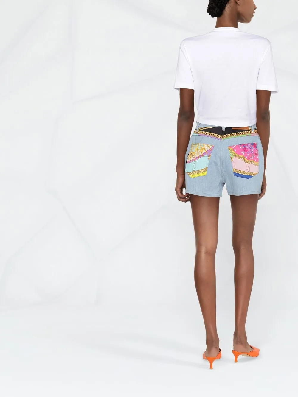 Белый розовый золотистый хлопок принт с логотипом на груди люрекс отделка кисточками декор Medusa Safety Pin золотистая фурнитура круглый вырез короткие рукава укороченная длина неравномерный подол