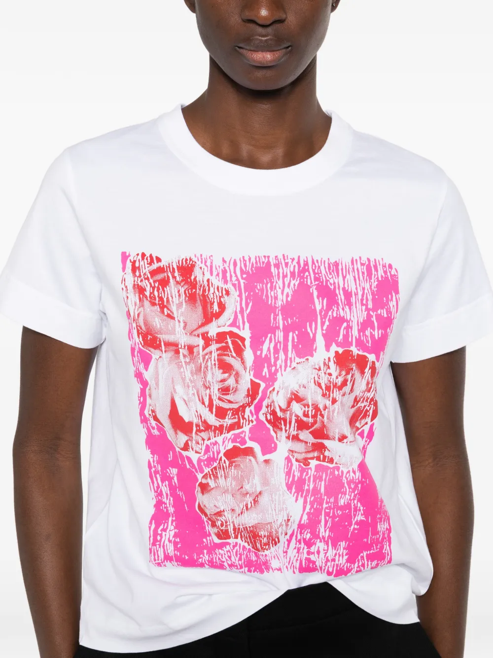 Белая футболка с цветочным принтом, круглым вырезом и короткими рукавами