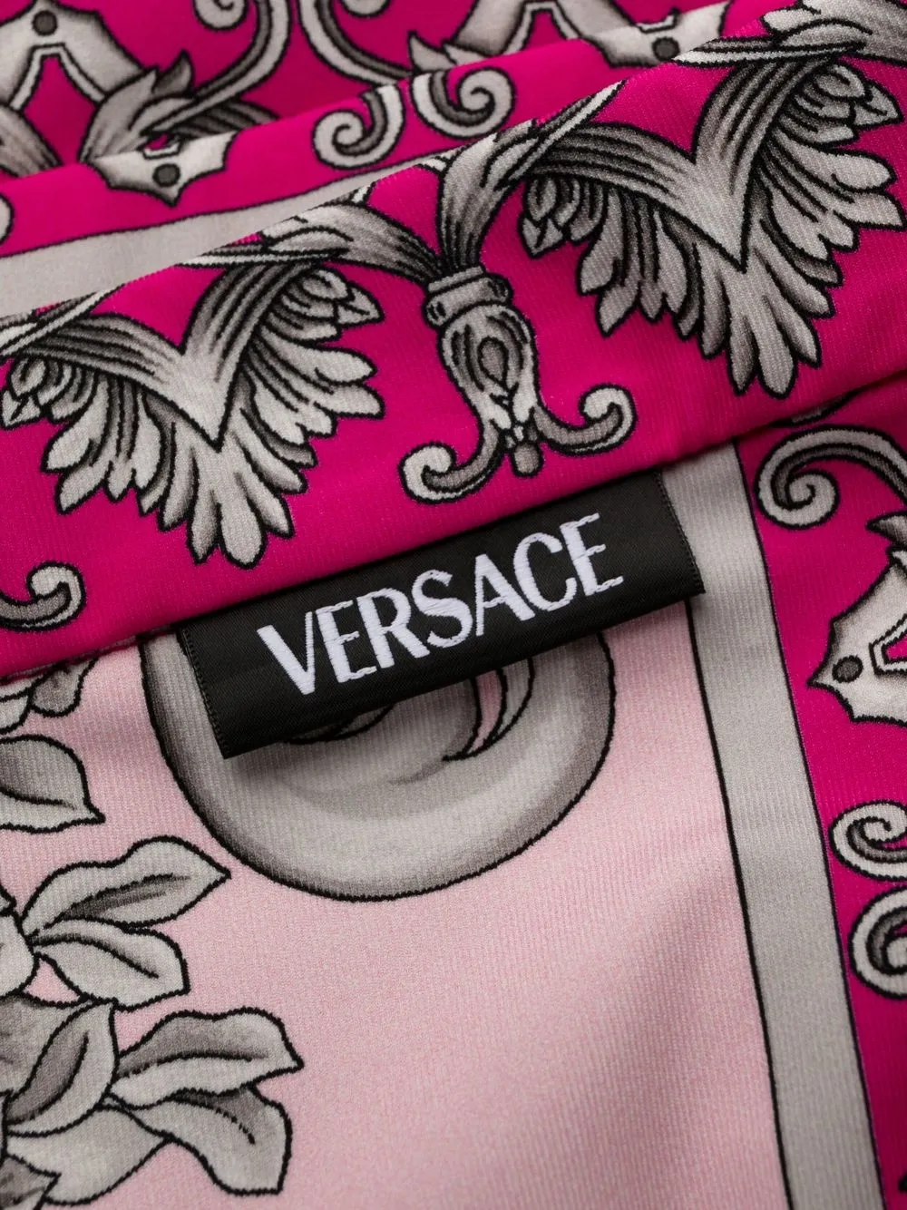 Фуксия, кремовый, эластичный материал, знаковый принт Barocco, завышенная талия и высота по щиколотку.