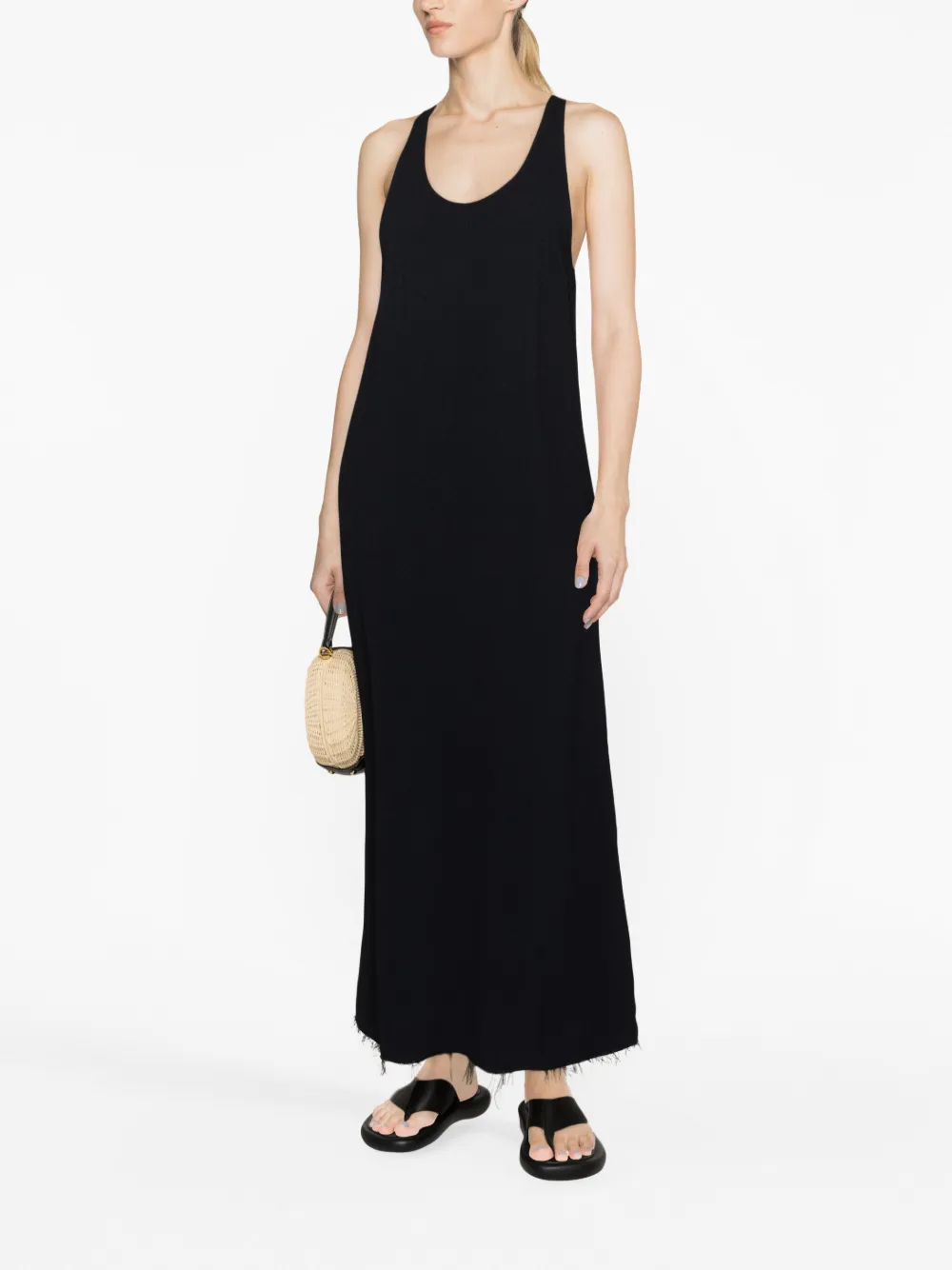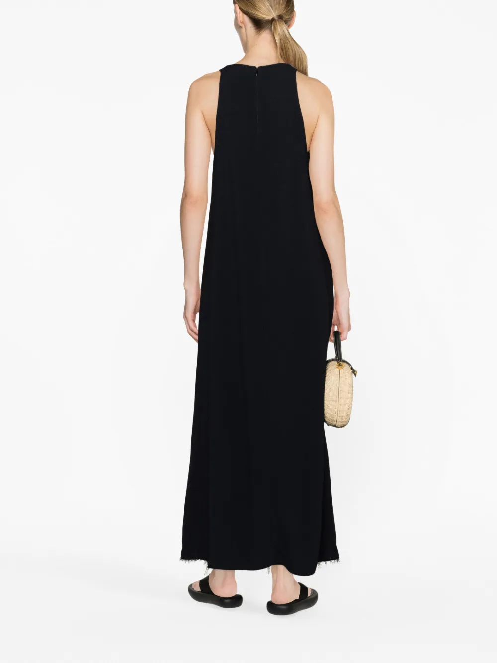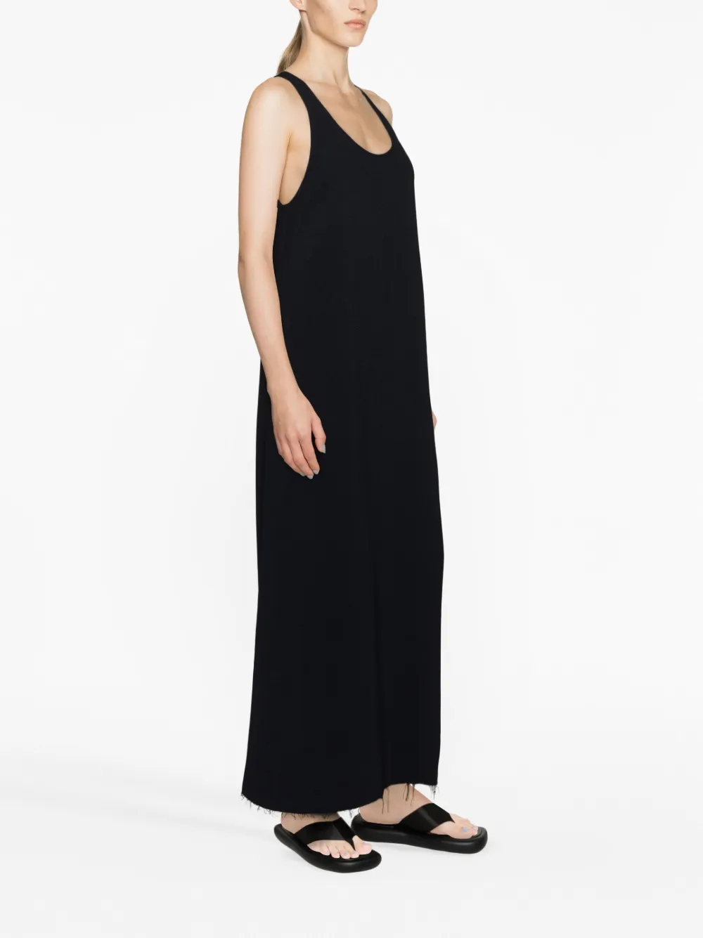 Черный, U-образный вырез, без рукавов, А-образный силуэт, необработанный подол и длина макси.