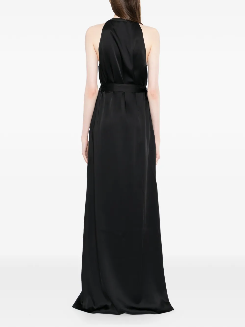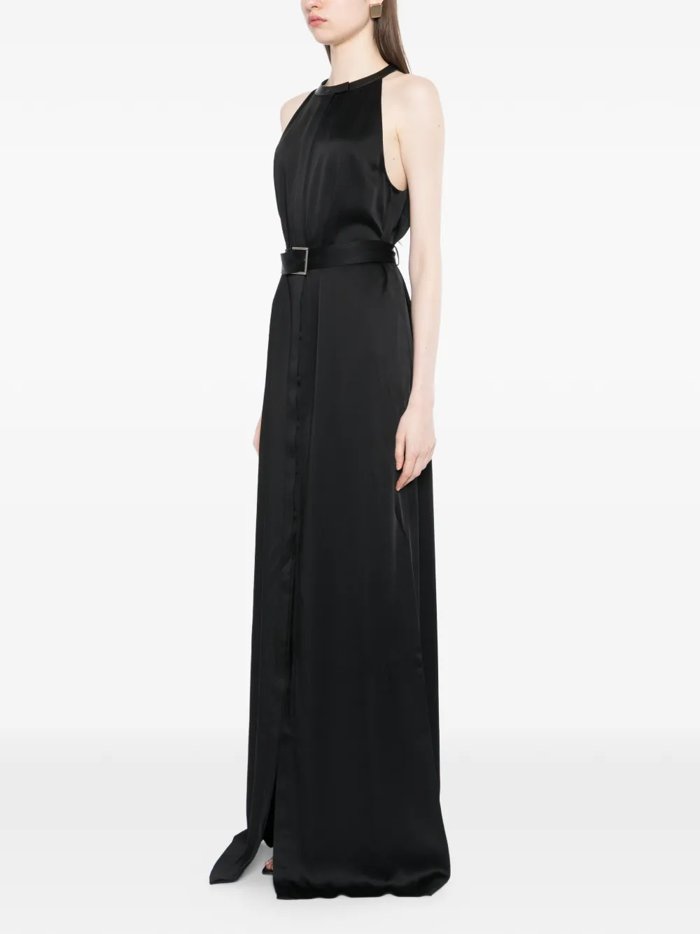 Черное платье макси длины с круглым вырезом, без рукавов, с поясом и разрезом спереди