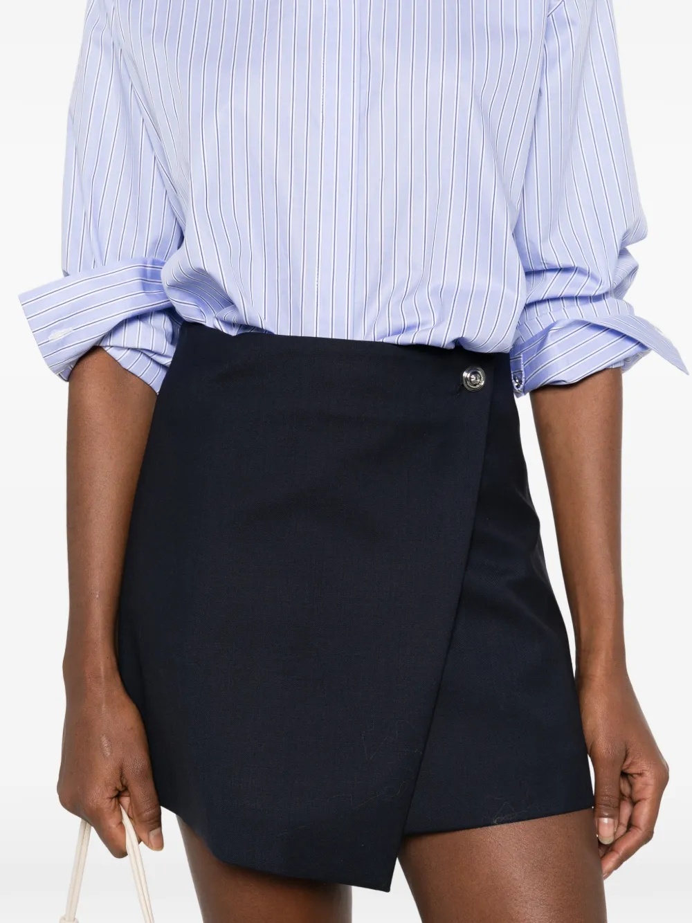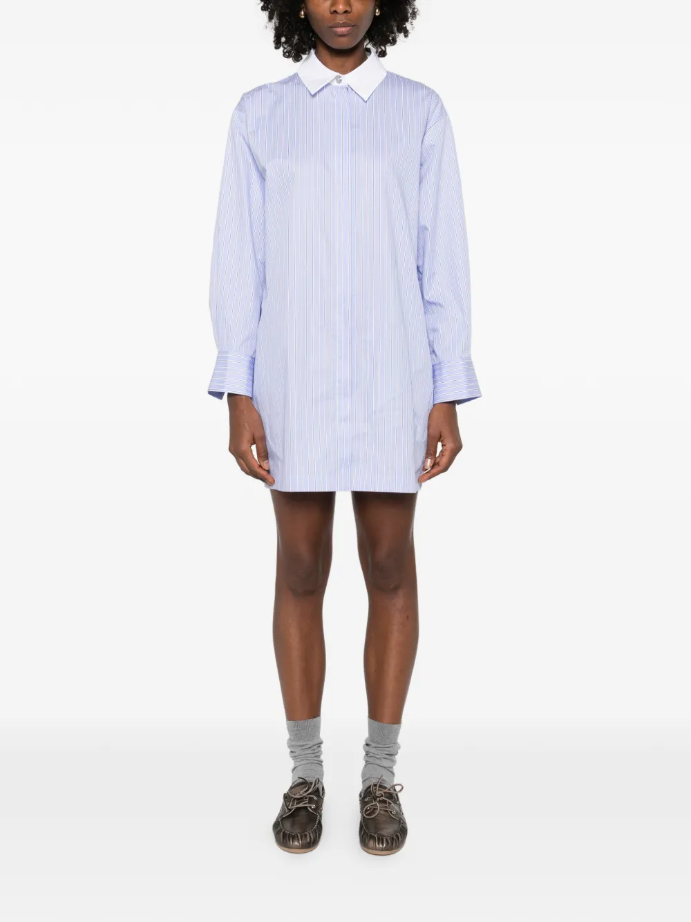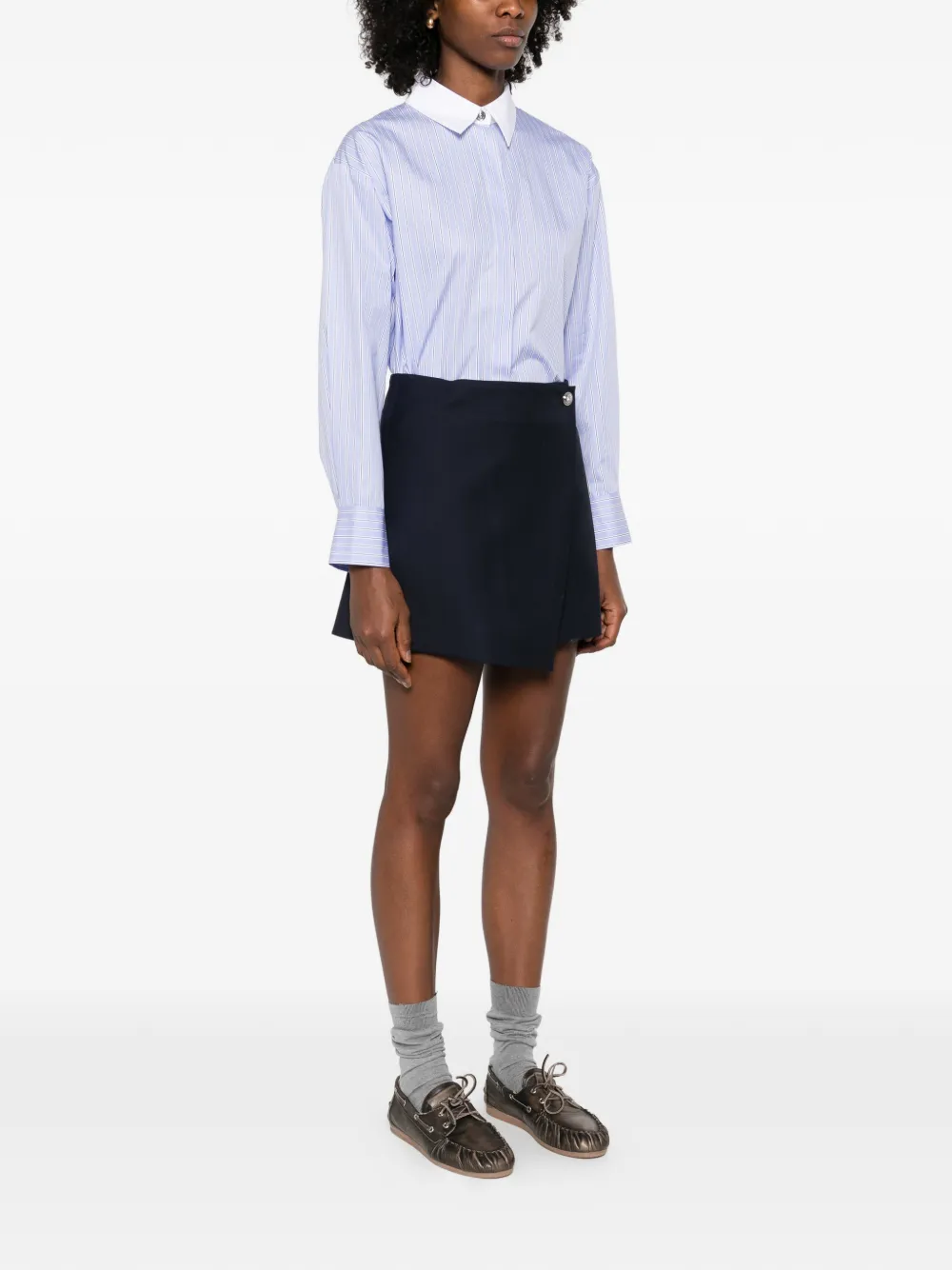 Синяя асимметричная юбка-рубашка в полоску с воротником, длинными рукавами и декоративными пуговицами