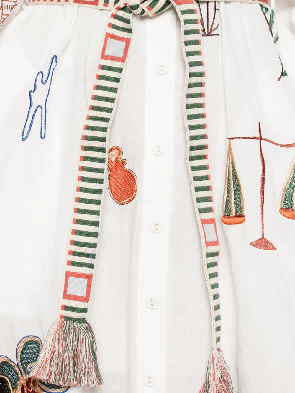 Белая рубашка с вышитыми деталями, застежкой на поясе, кисточками, застежкой на пуговицы, длинными рукавами