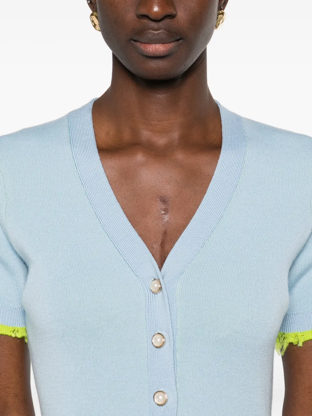 Синяя футболка с V-образным вырезом, короткими рукавами, кружевной отделкой, украшением из жемчуга и прорезными карманами