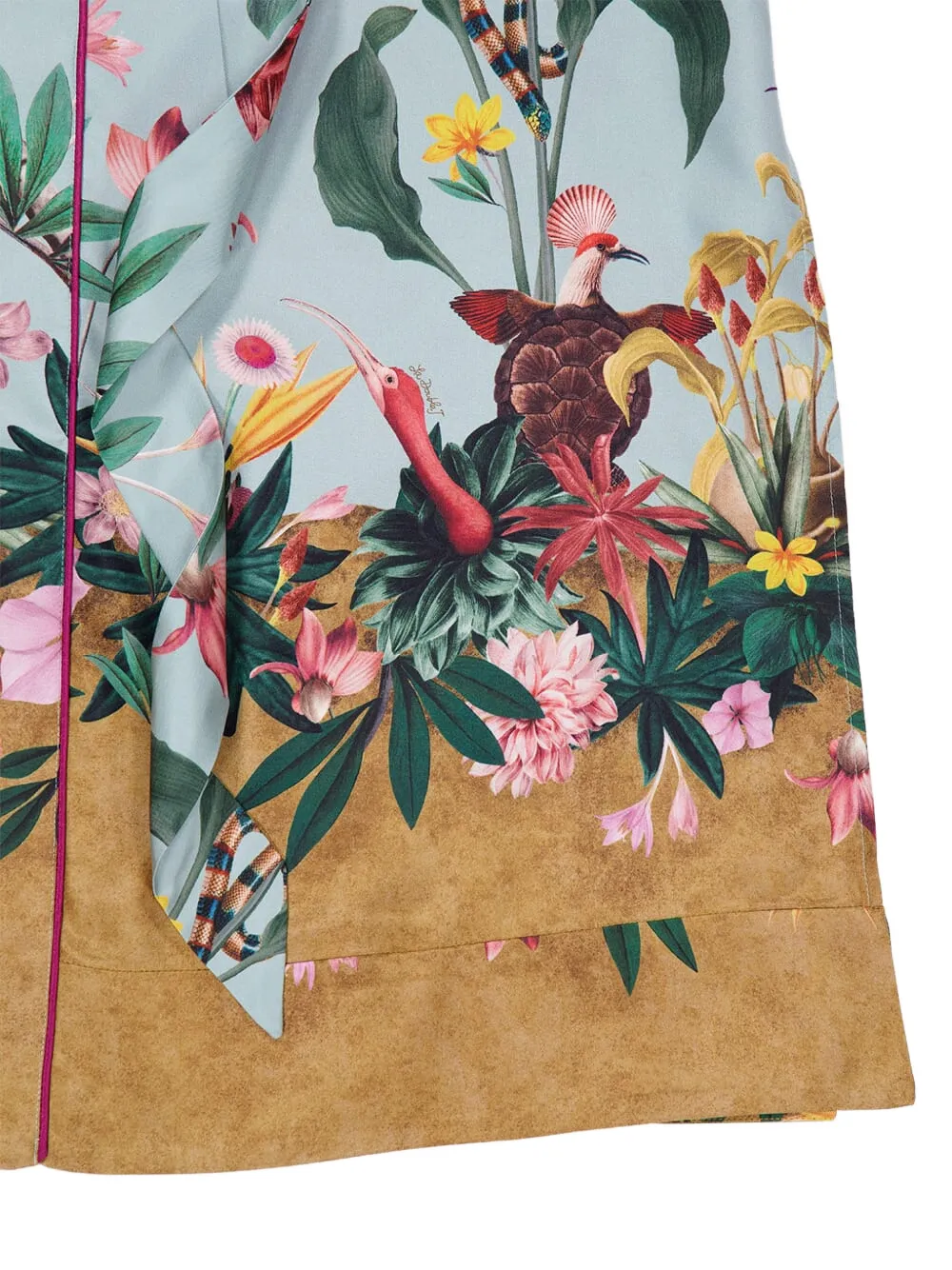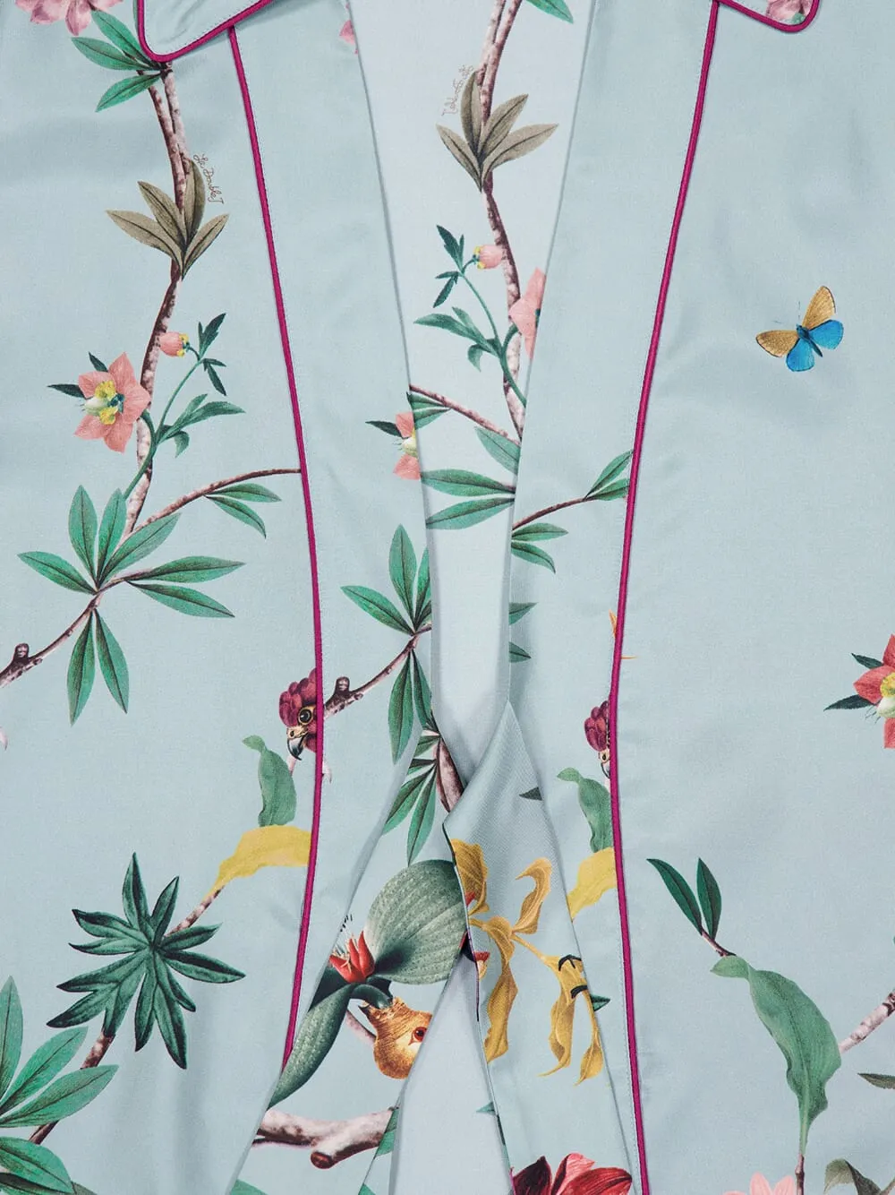Светло-голубой с цветочным принтом, с саржевой текстурой, с поясом на талии, длинными рукавами, с отделкой кантом