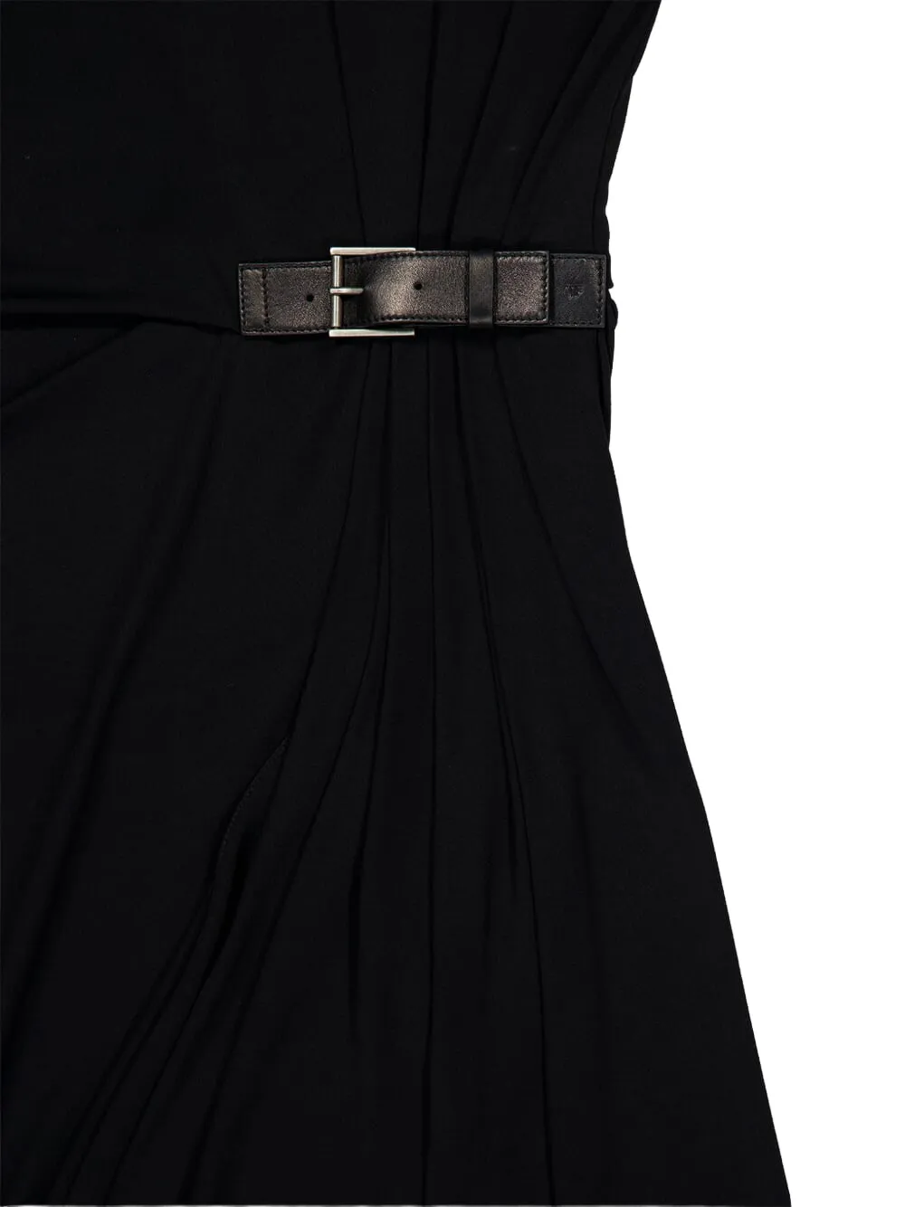Черное кожаное платье без рукавов с поясом, драпировкой и миди-длиной