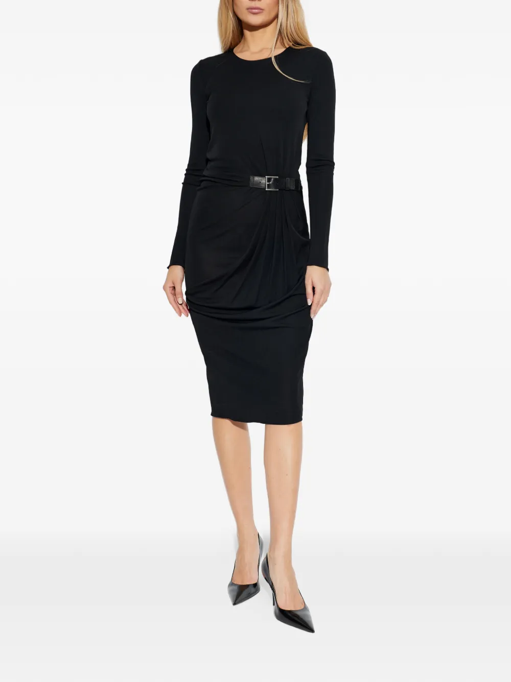 Черная с длинными рукавами, круглым вырезом, ремнем, драпировкой, приталенного кроя