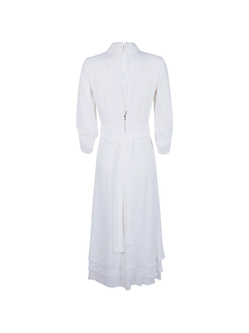 Цвет слоновой кости, воротник с прямыми концами, рукава три четверти, оборчатый низ, завязывающийся на талии