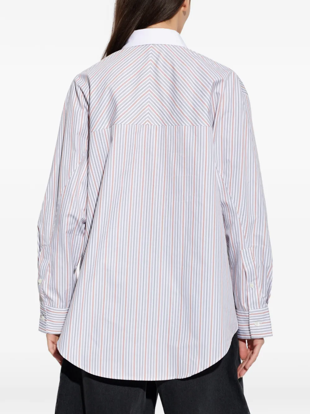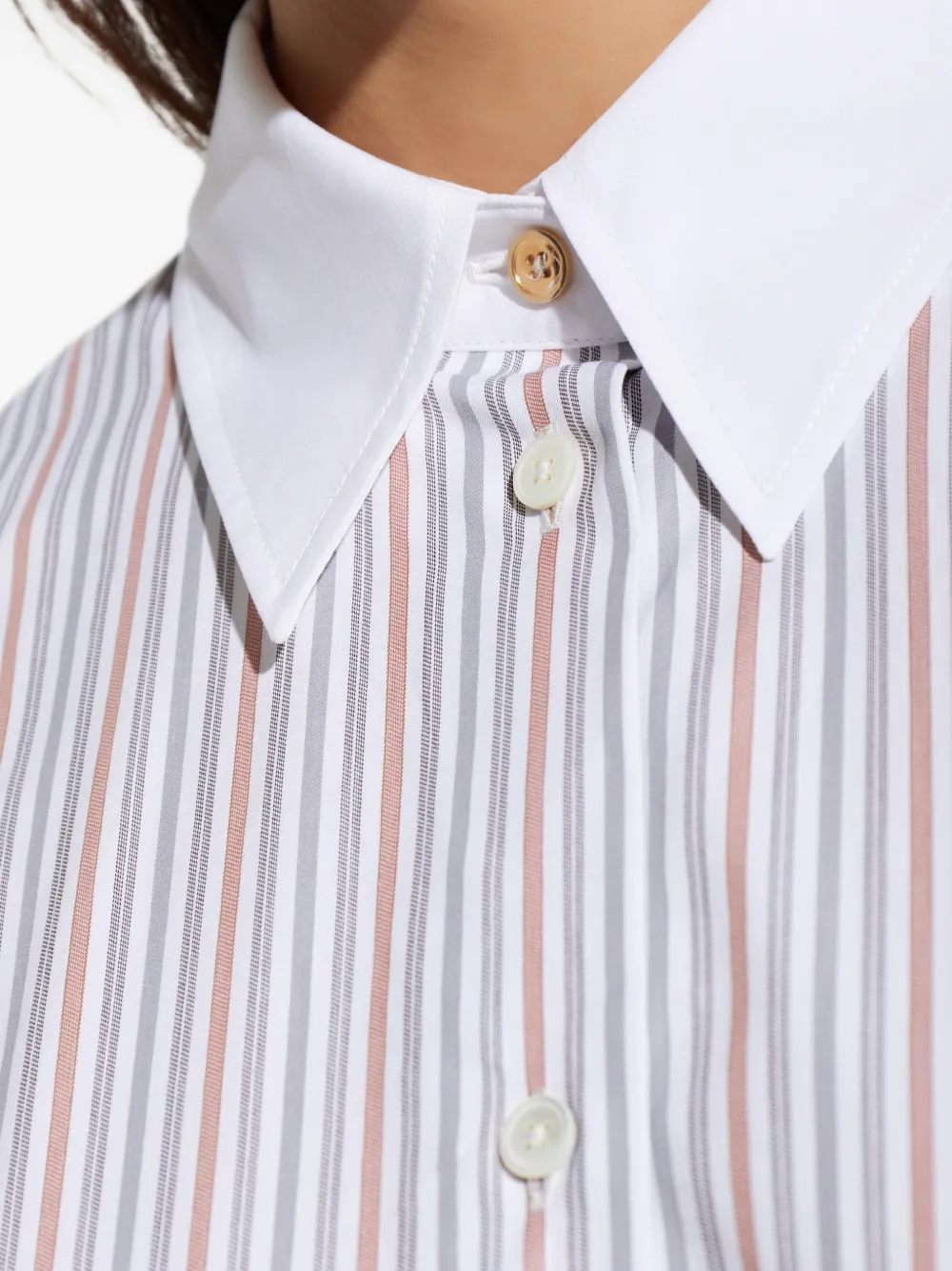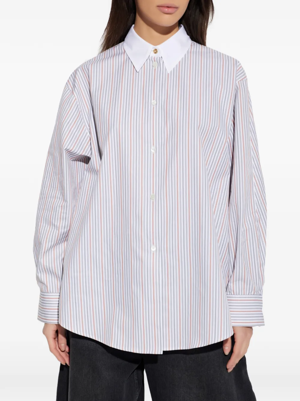 Белая рубашка с полосатым рисунком, контрастным воротником, застежкой на пуговицы и закругленным подолом