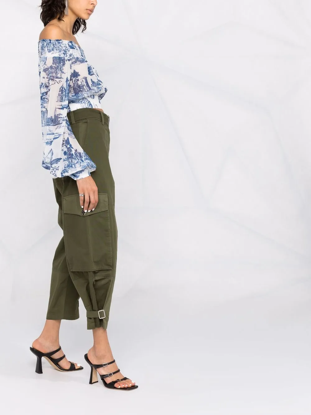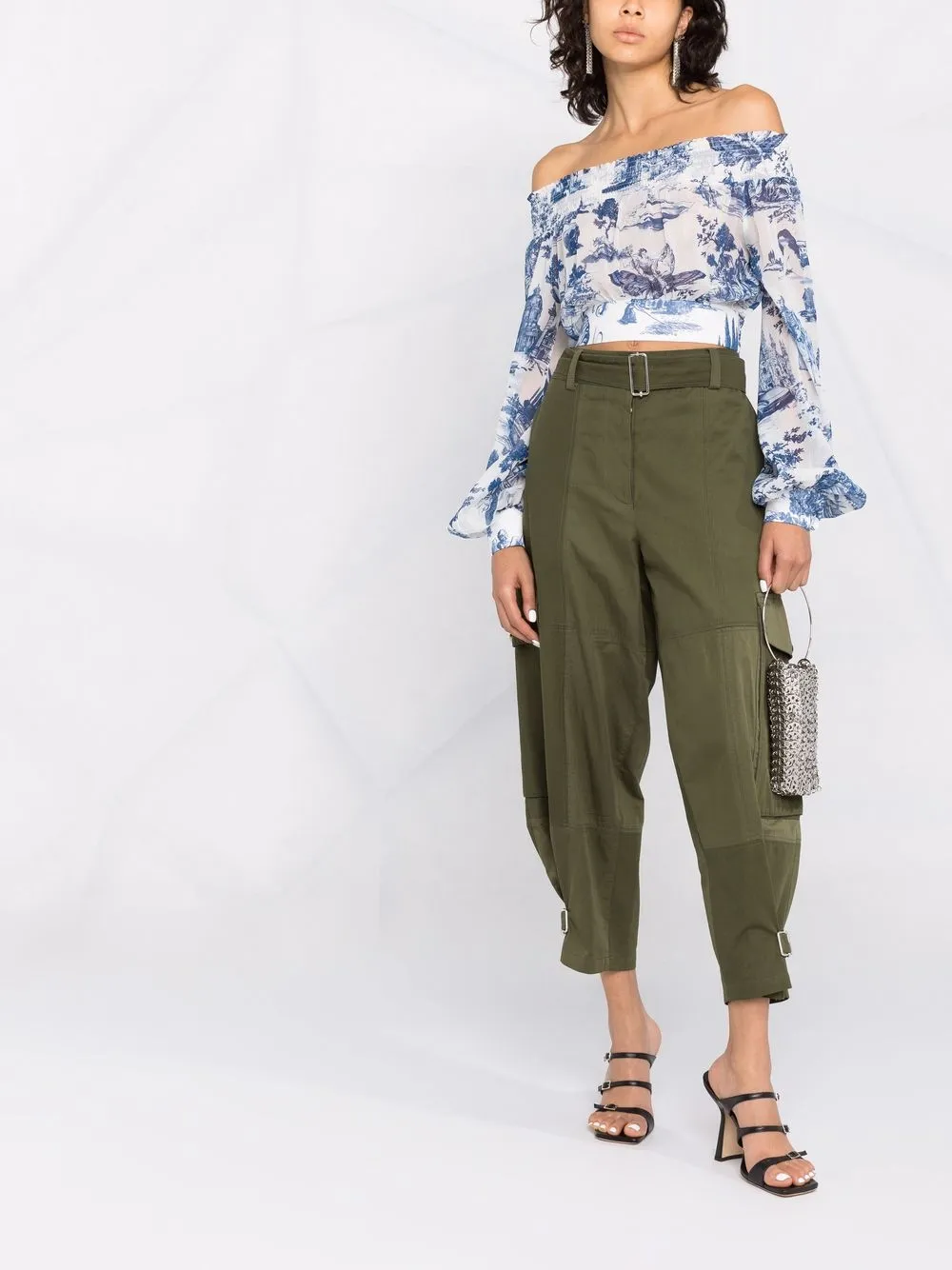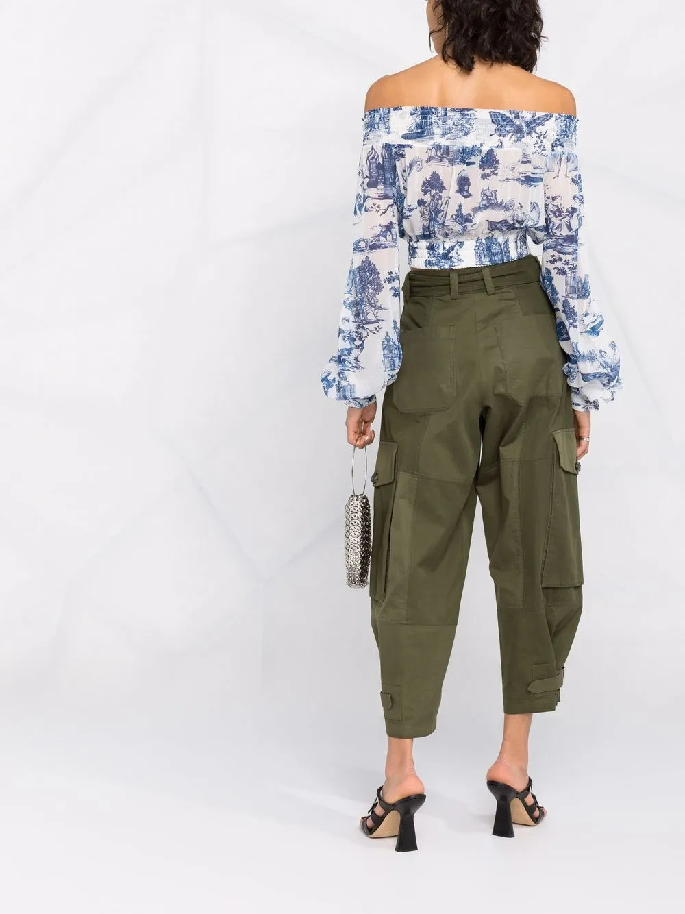 Графичный принт, открытые плечи, рукава «епископ», эластичный подол и укороченная длина.