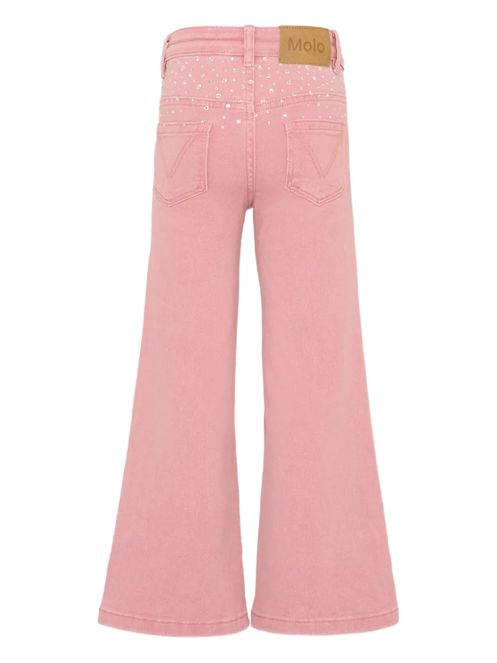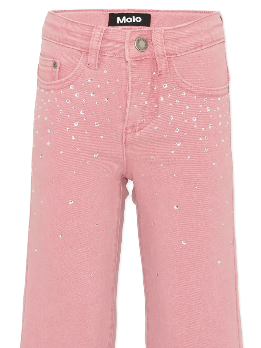 Розовые декоративные элементы, шлевки для пояса, пять карманов, широкий крой брючин