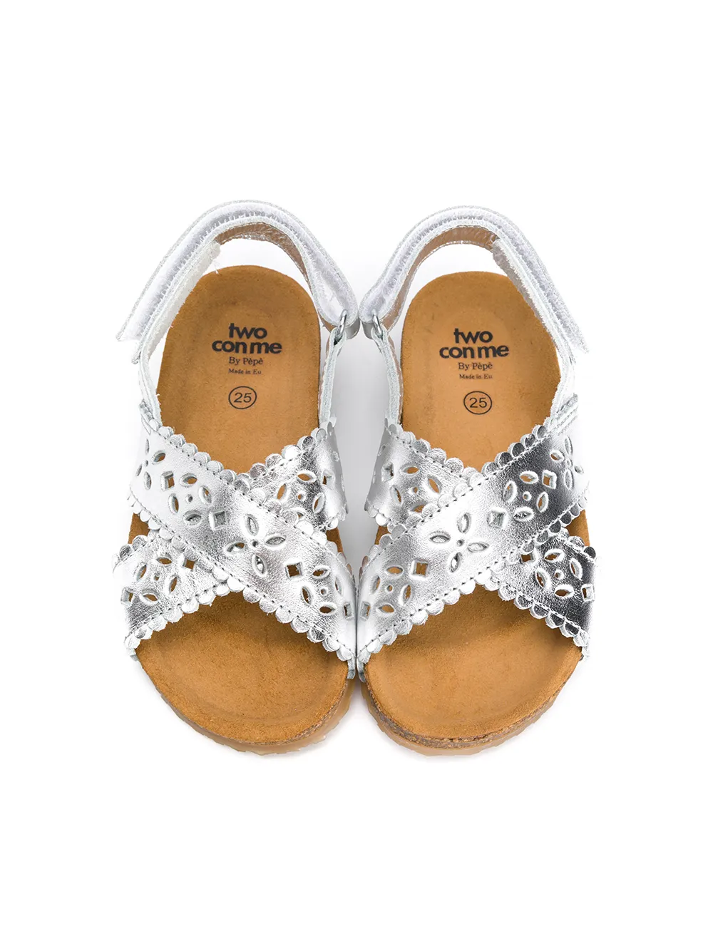 Сандалии с прорезями от Pèpè. Открытый носок, перекрещивающиеся спереди ремешки, с открытой пяткой, застежка на липучке и ребристая резиновая подошва. Цвет: серебристый.