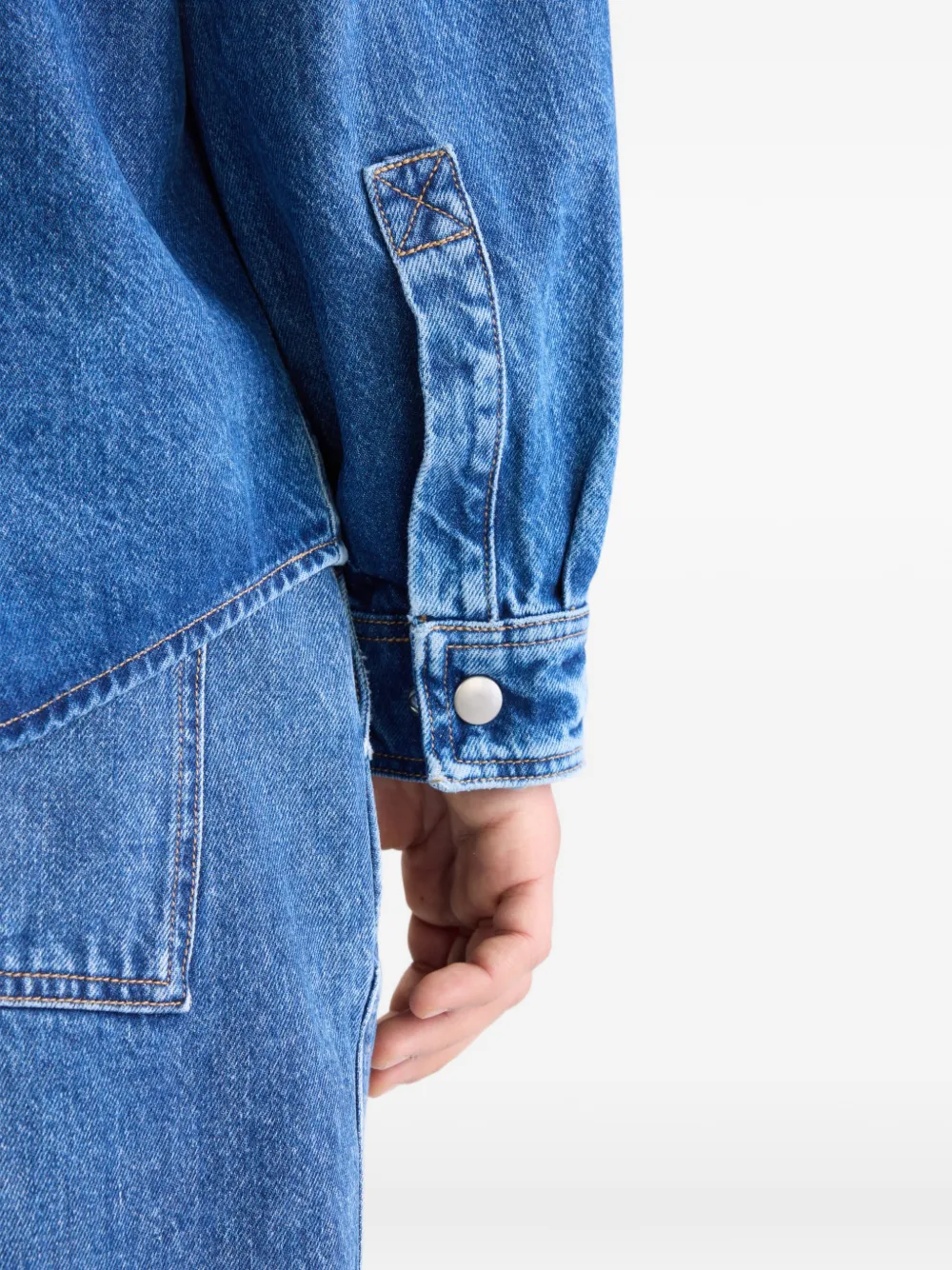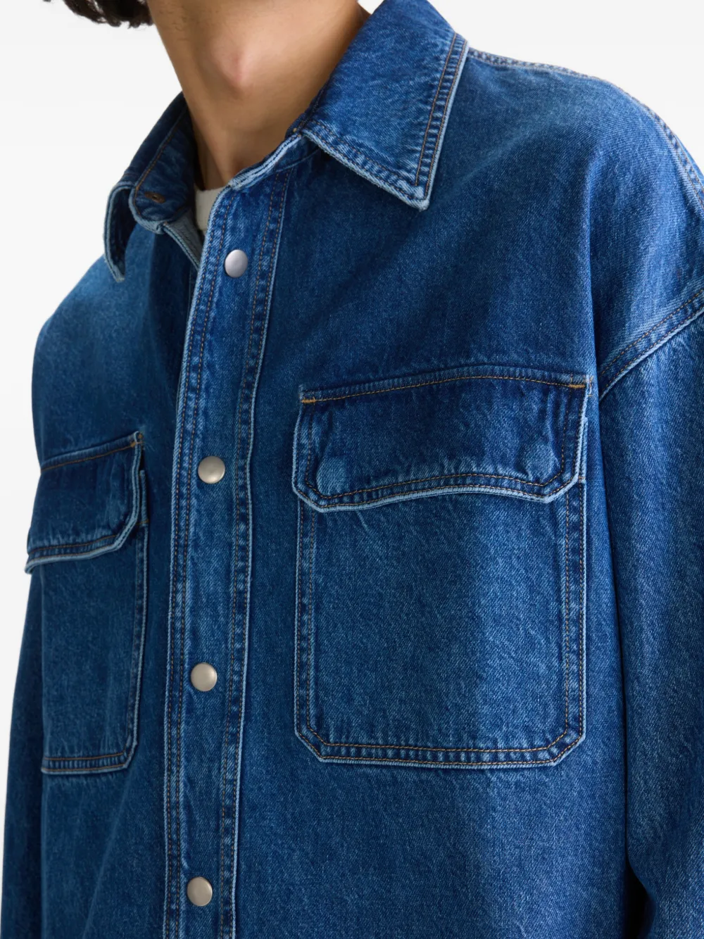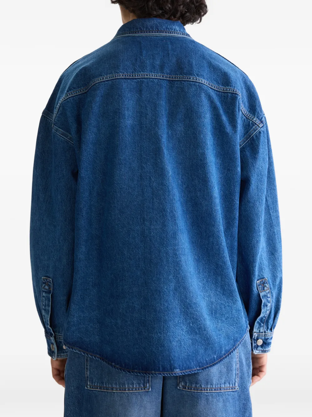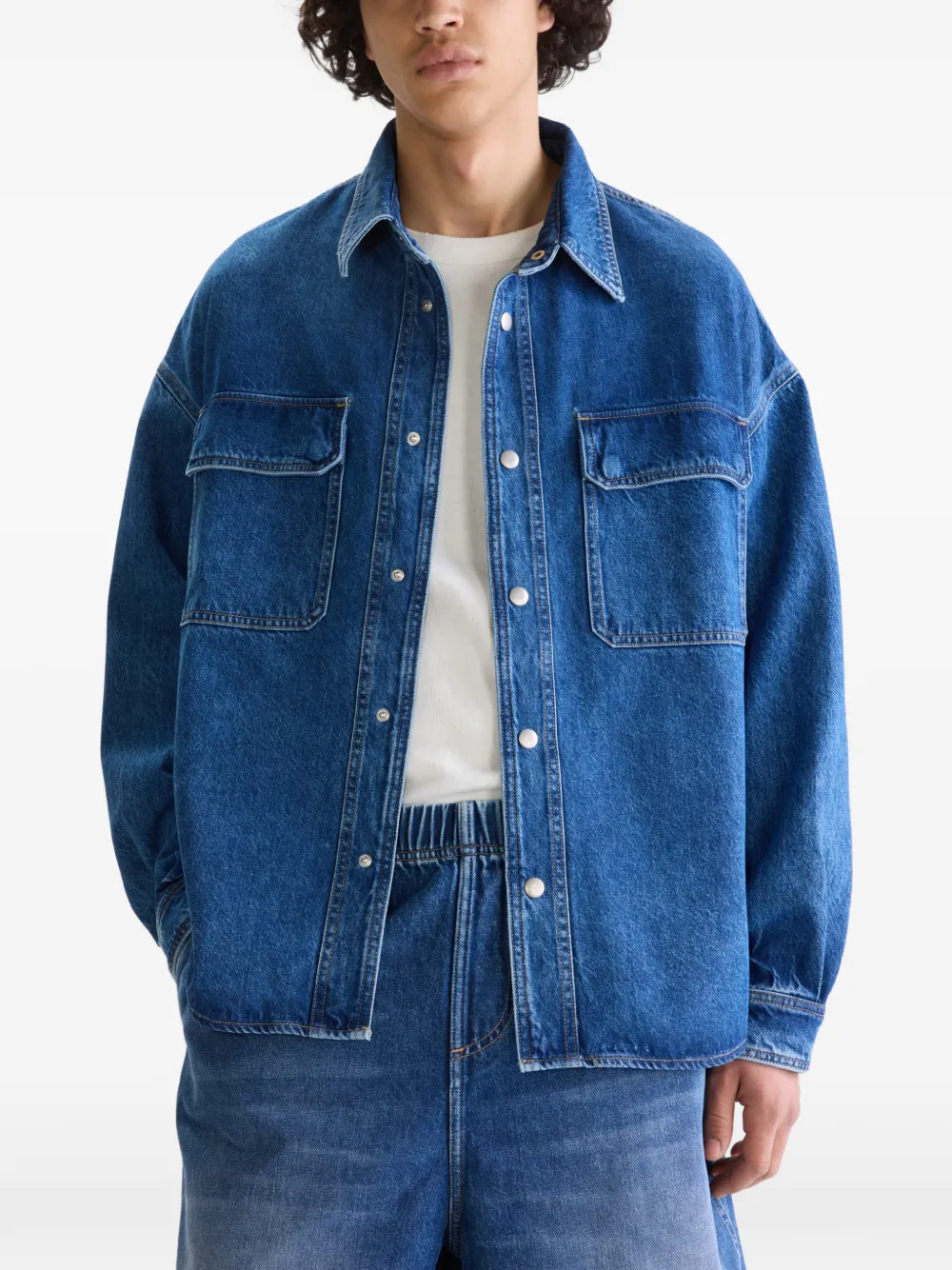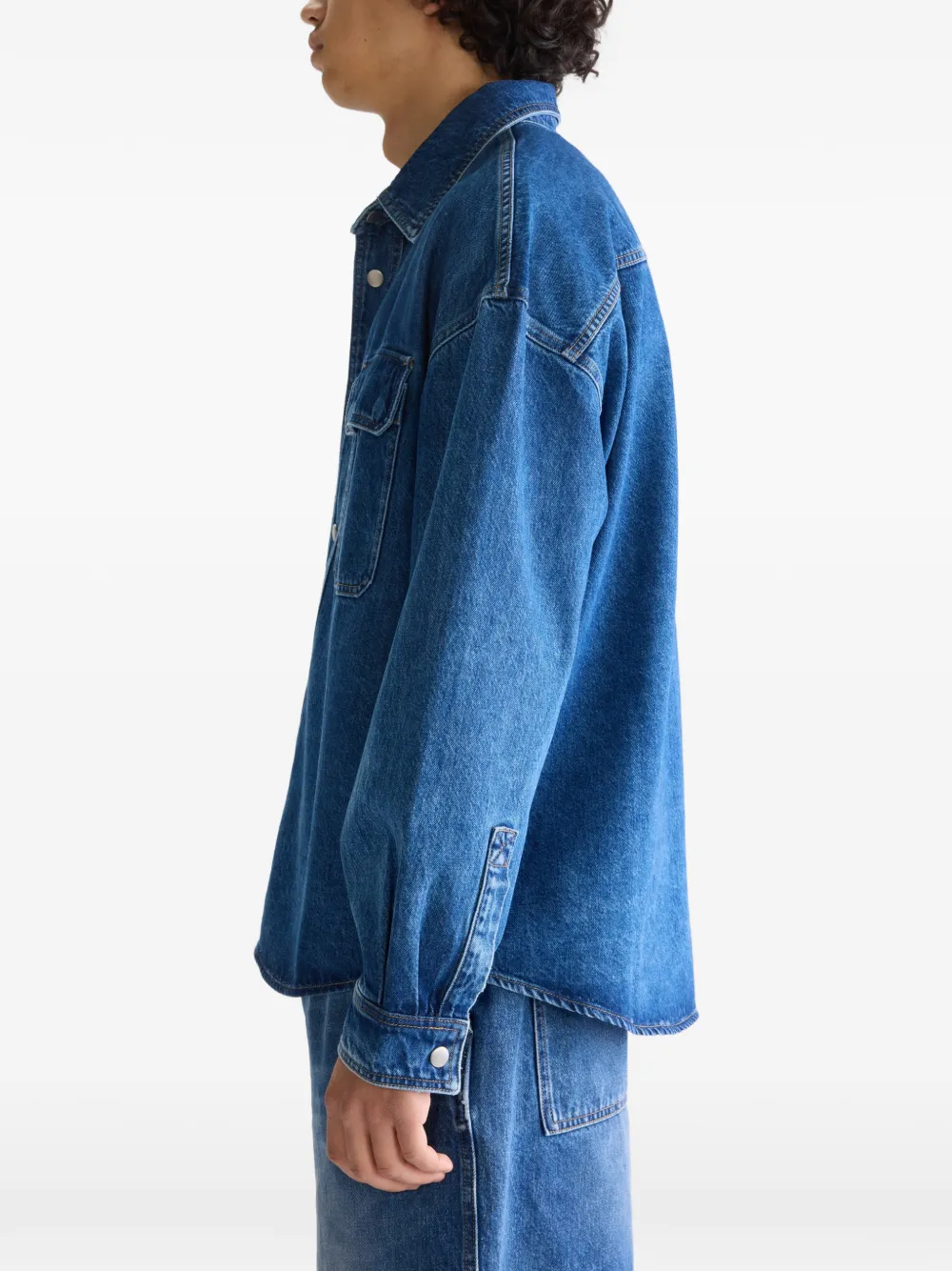 Голубая рубашка с застежкой на пуговицы спереди, манжетами на пуговицах, накладными карманами на груди, отстрочкой и воротником-стойкой