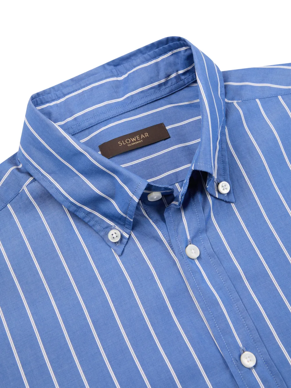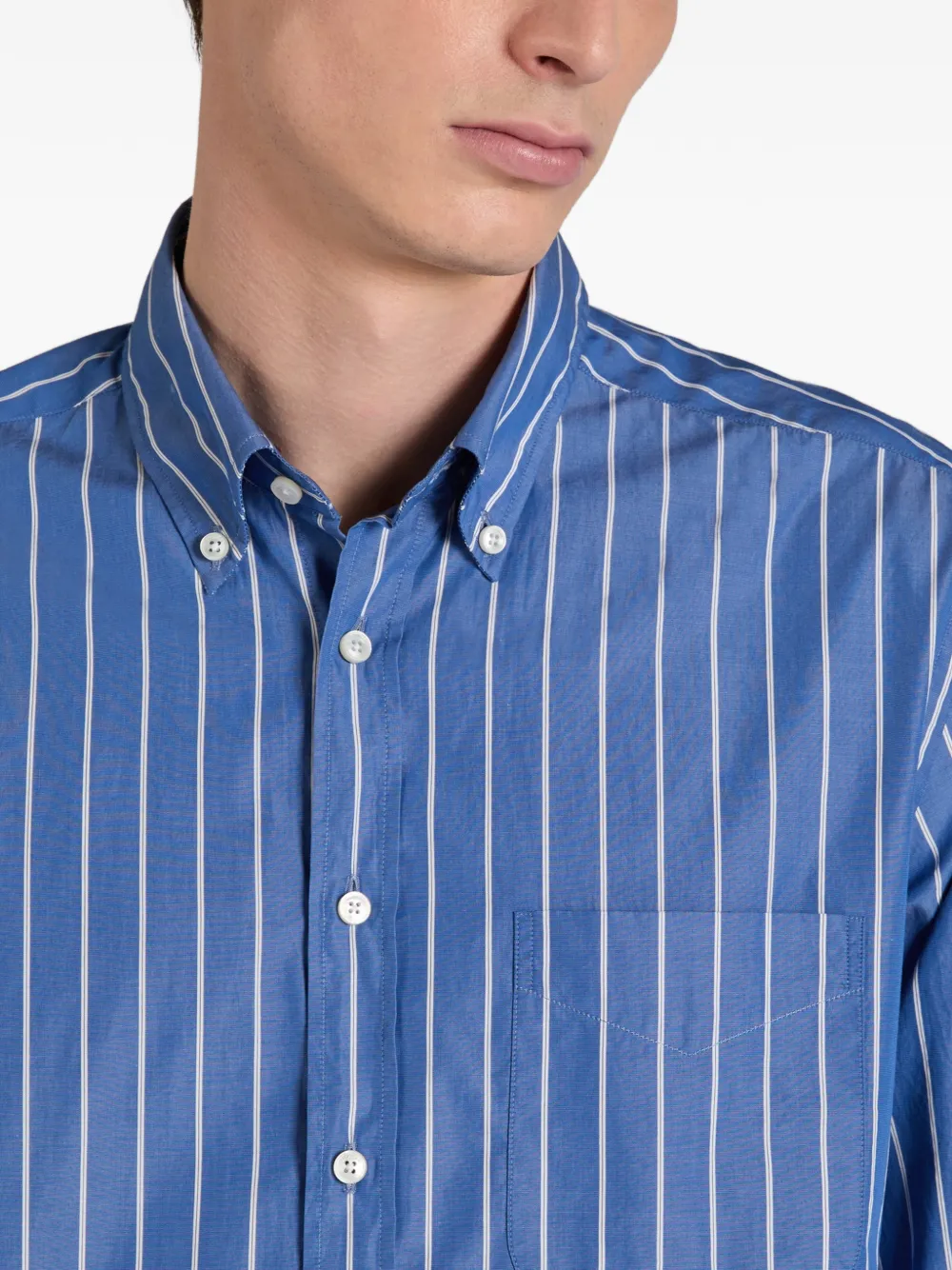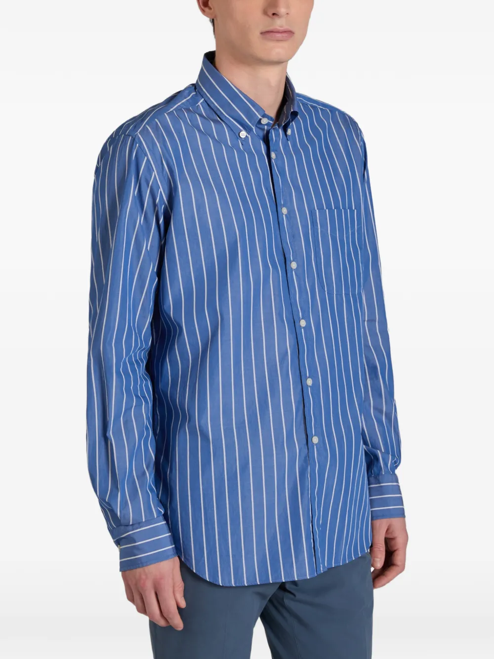Средне-синий цвет, полосатый узор, застежка на пуговицы, воротник на пуговицах, накладной карман на груди, длинные рукава