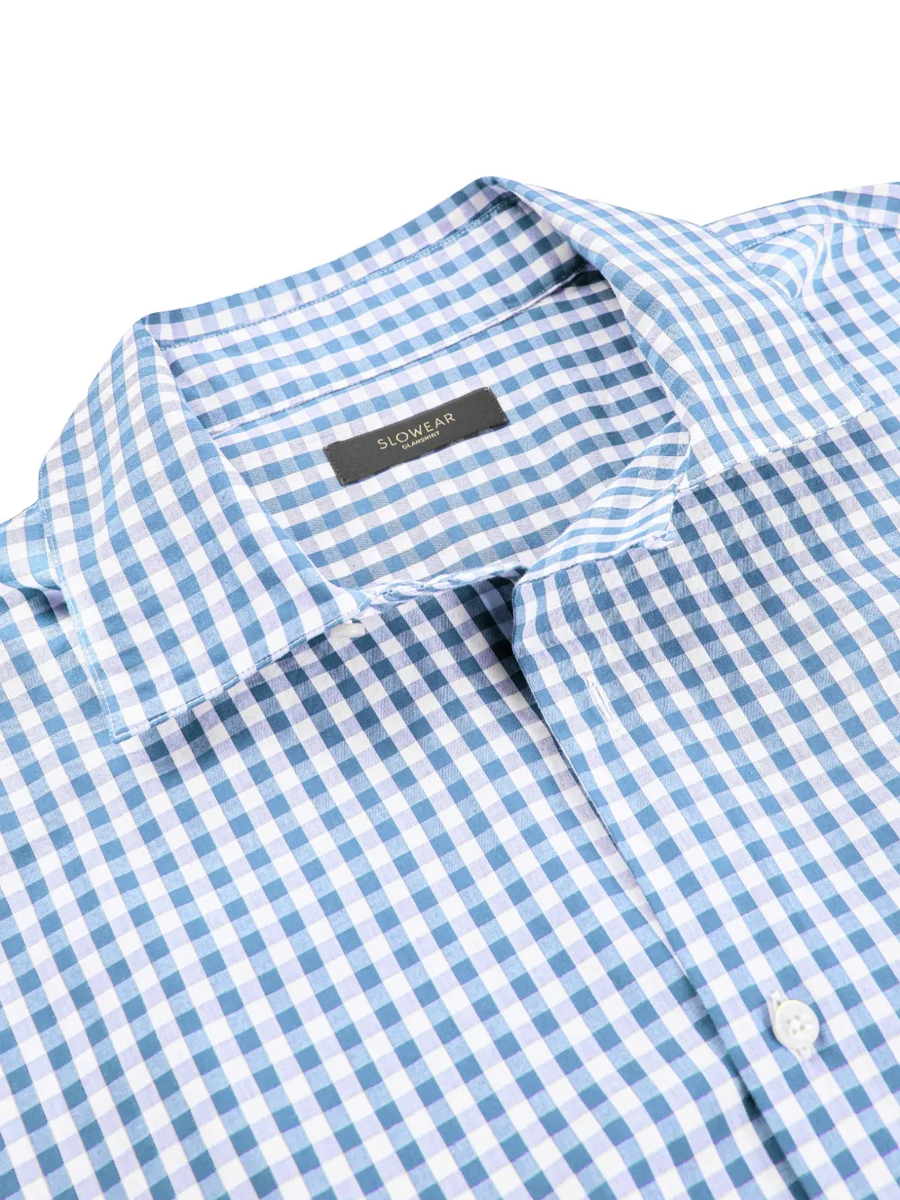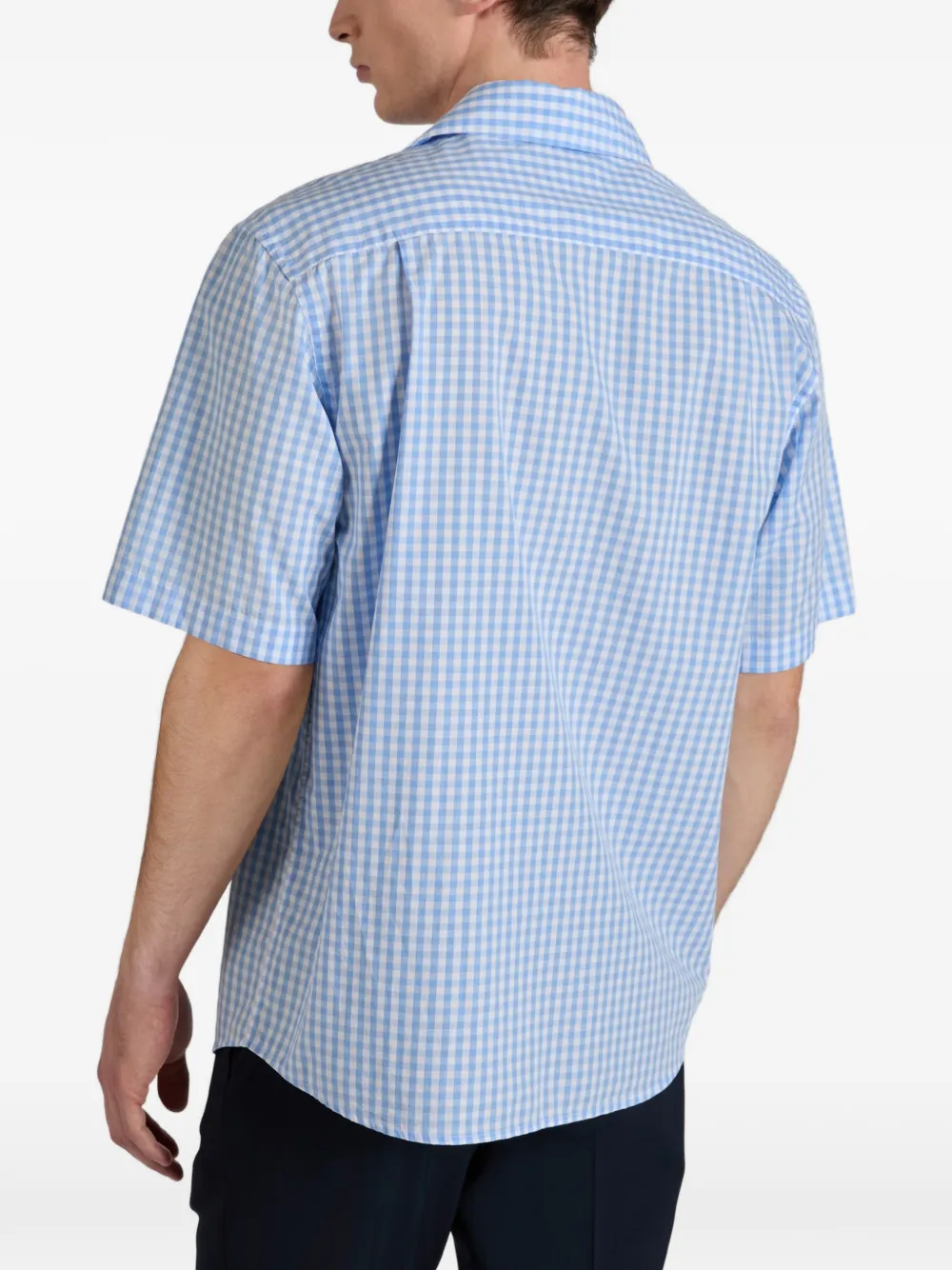 Светло-голубая рубашка в клетку с короткими рукавами, застежкой на пуговицах и отложным воротником
