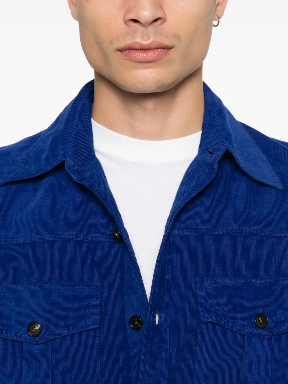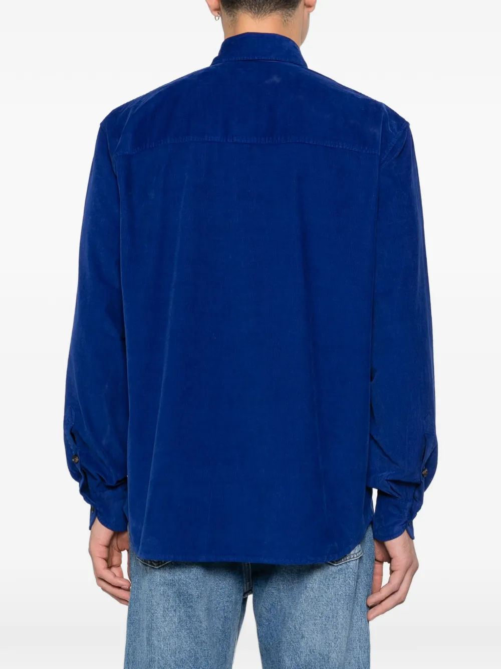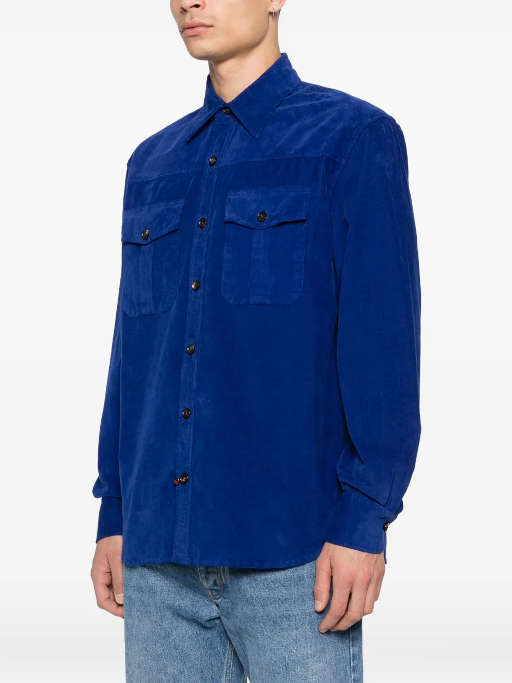 Синий цвет, застежка на пуговицы, воротник-пойнт, длинные рукава, манжеты на пуговицах, нагрудные карманы