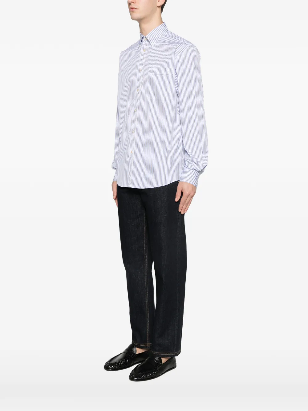 Белая и голубая полосатая расцветка, нагрудный карман, застежка на пуговицы, длинные рукава, манжеты на пуговицах