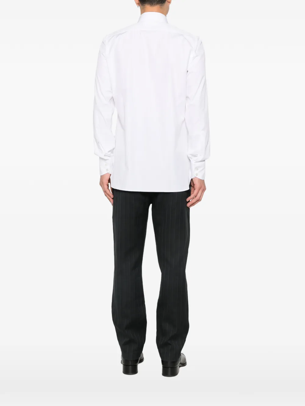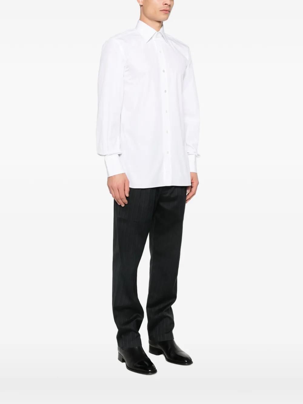Белая рубашка с длинными рукавами, застежкой на пуговицы спереди, манжетами на пуговицах и отложным воротником