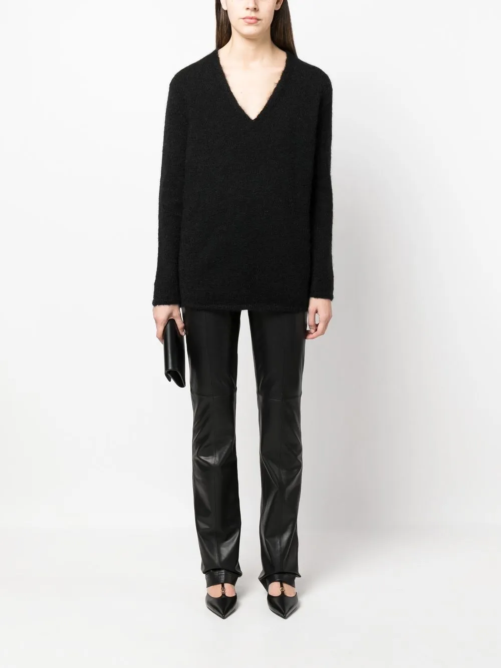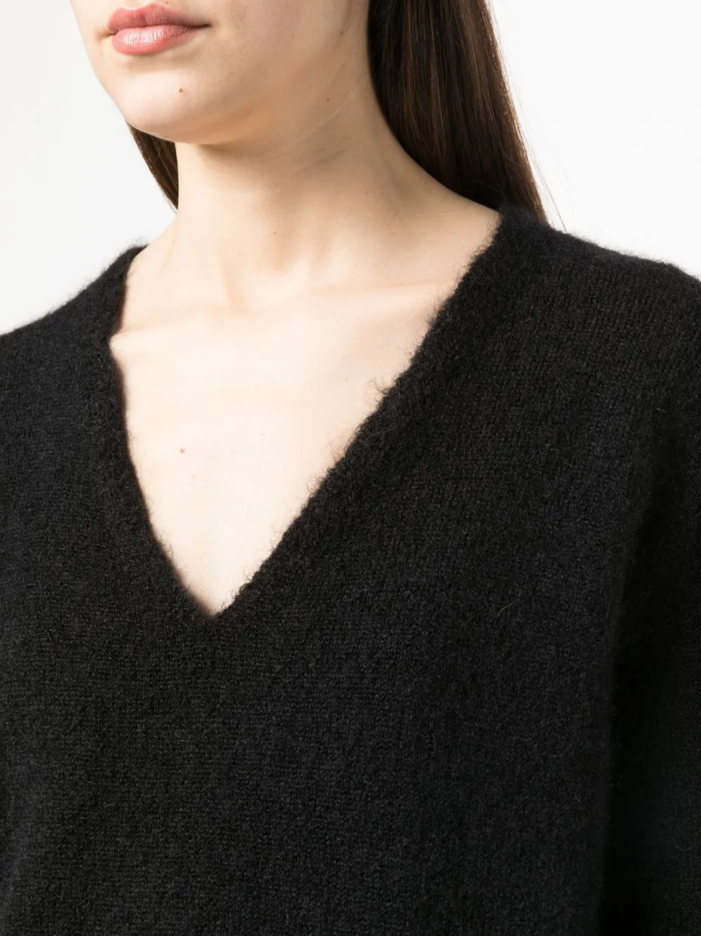 Черный, мохер, трикотажный материал, V-образный вырез, длинные рукава и прямой подол.