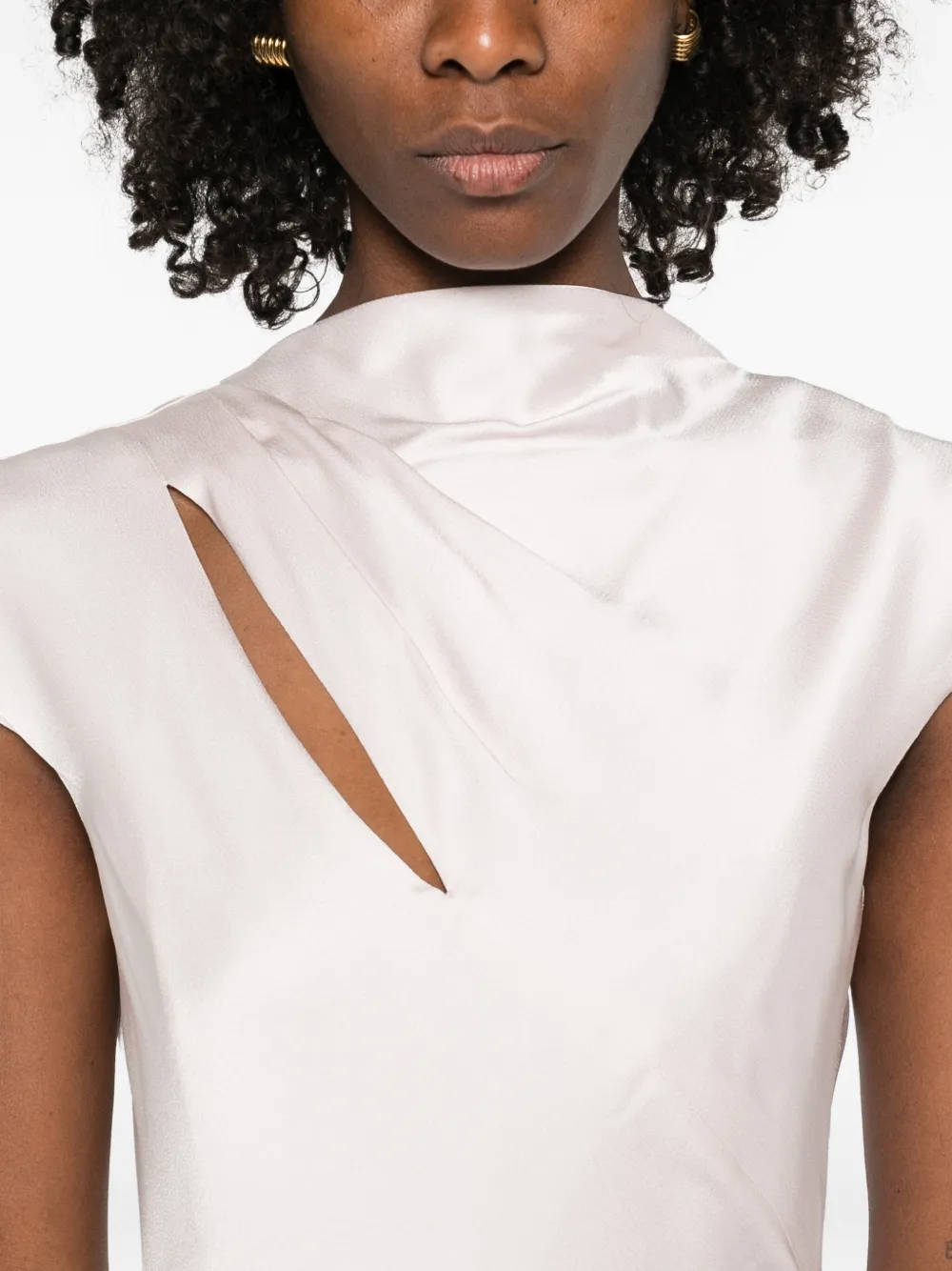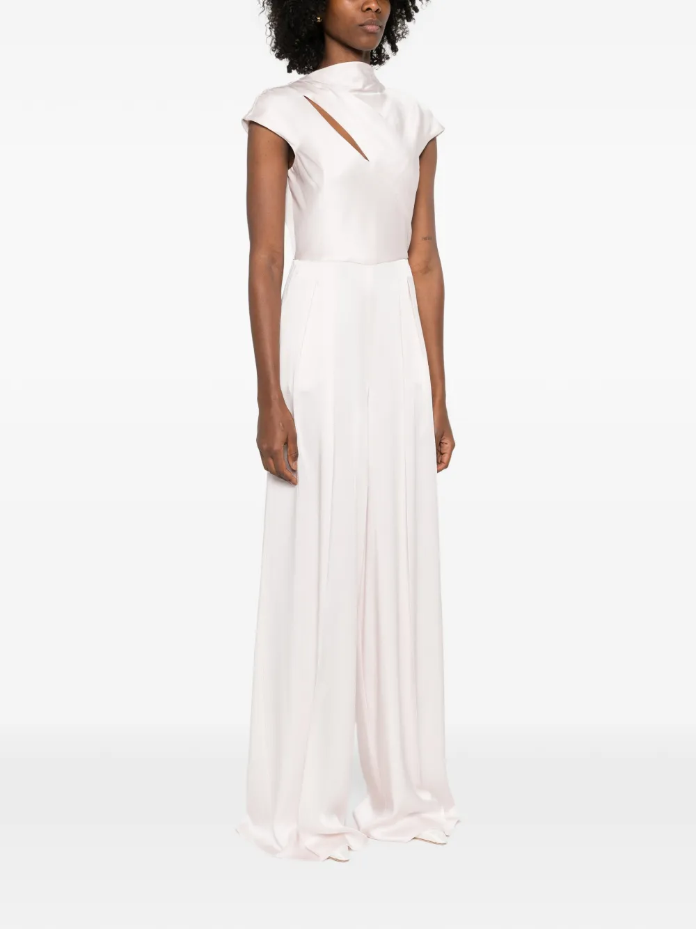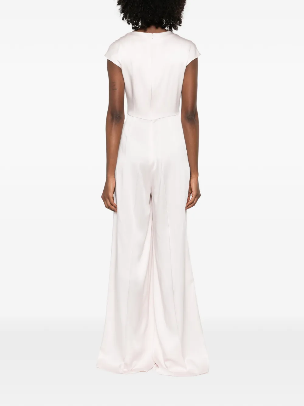 Светло-розовый цвет, драпировка, широкие брючины, без рукавов, V-образный вырез, скрытая застежка-молния сзади