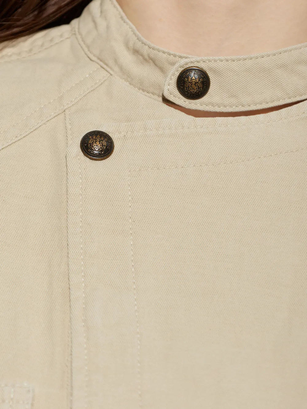 Бежевый ремень, длинные рукава, множество карманов, стойка-воротник