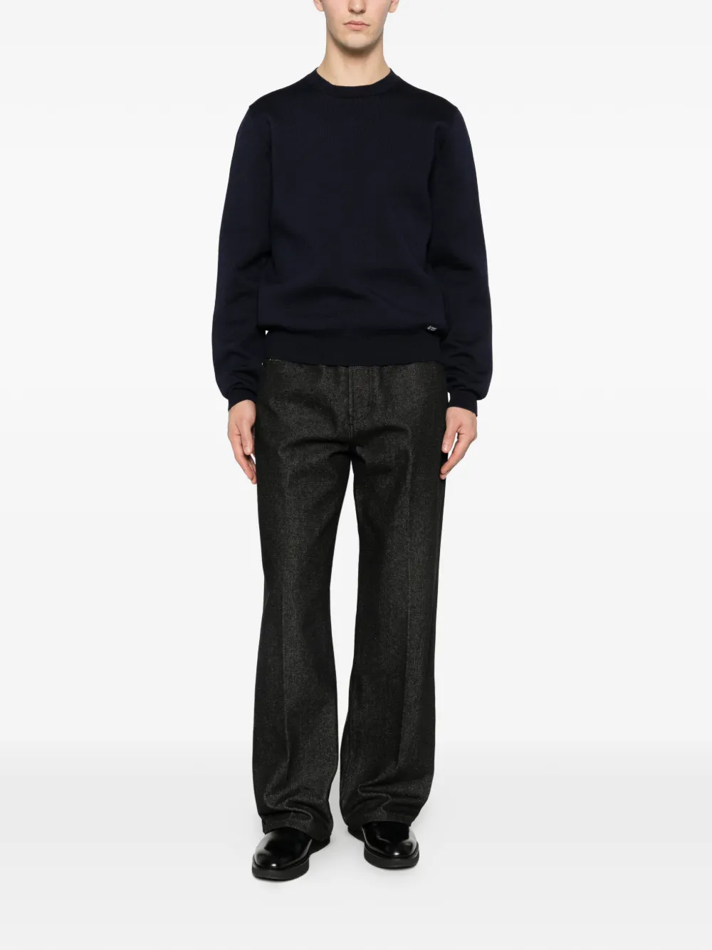 Темно-синий цвет, круглый вырез, длинные рукава, трикотажные манжеты, трикотажный нижний край