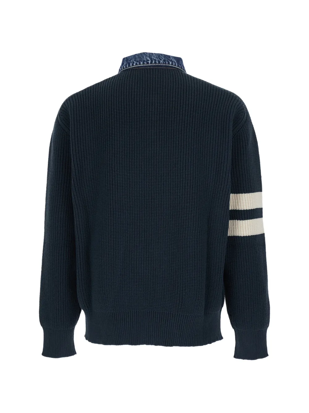 Синий джинсовый воротник, вышитый логотип, рубчатая вязка, застежка на пуговицы, детали в полоску