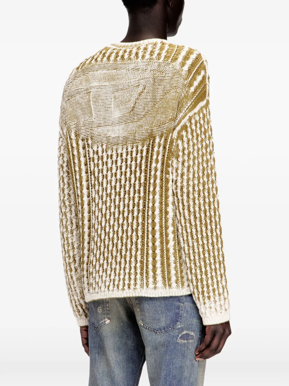 Коричнево-белый открытый трикотаж, круглый вырез, длинные рукава, овальный логотип D