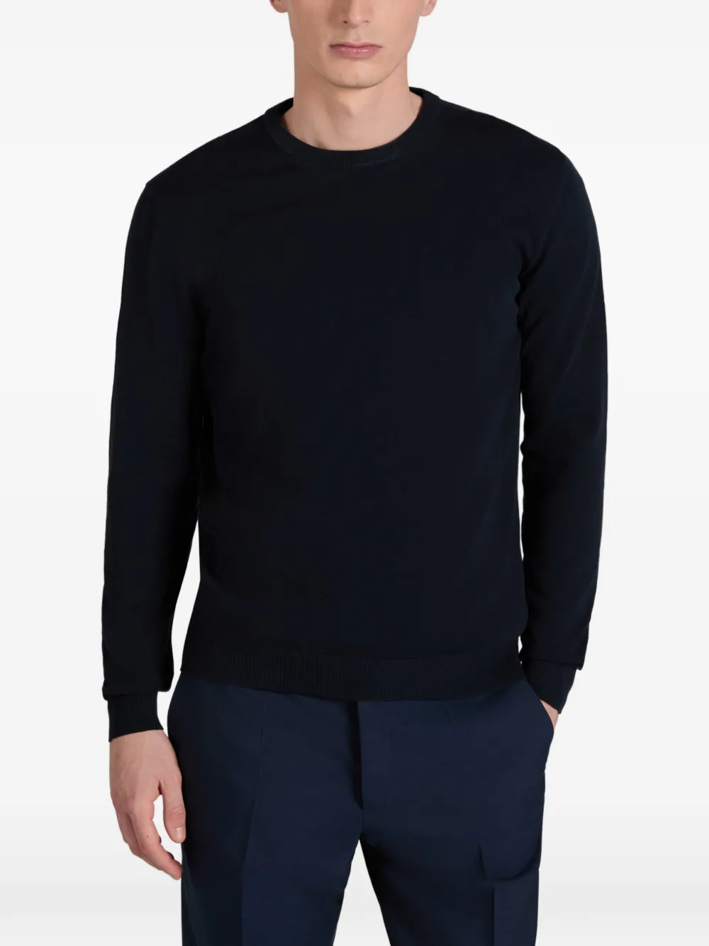 Темно-синий круглый вырез длинные рукава рубчатые манжеты и подол