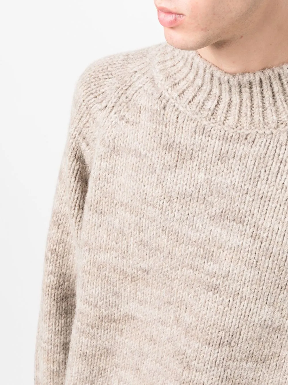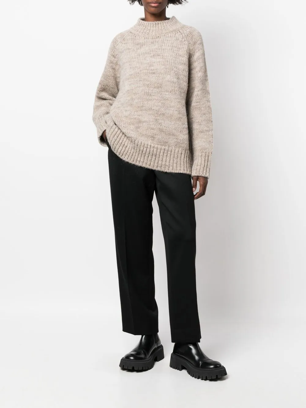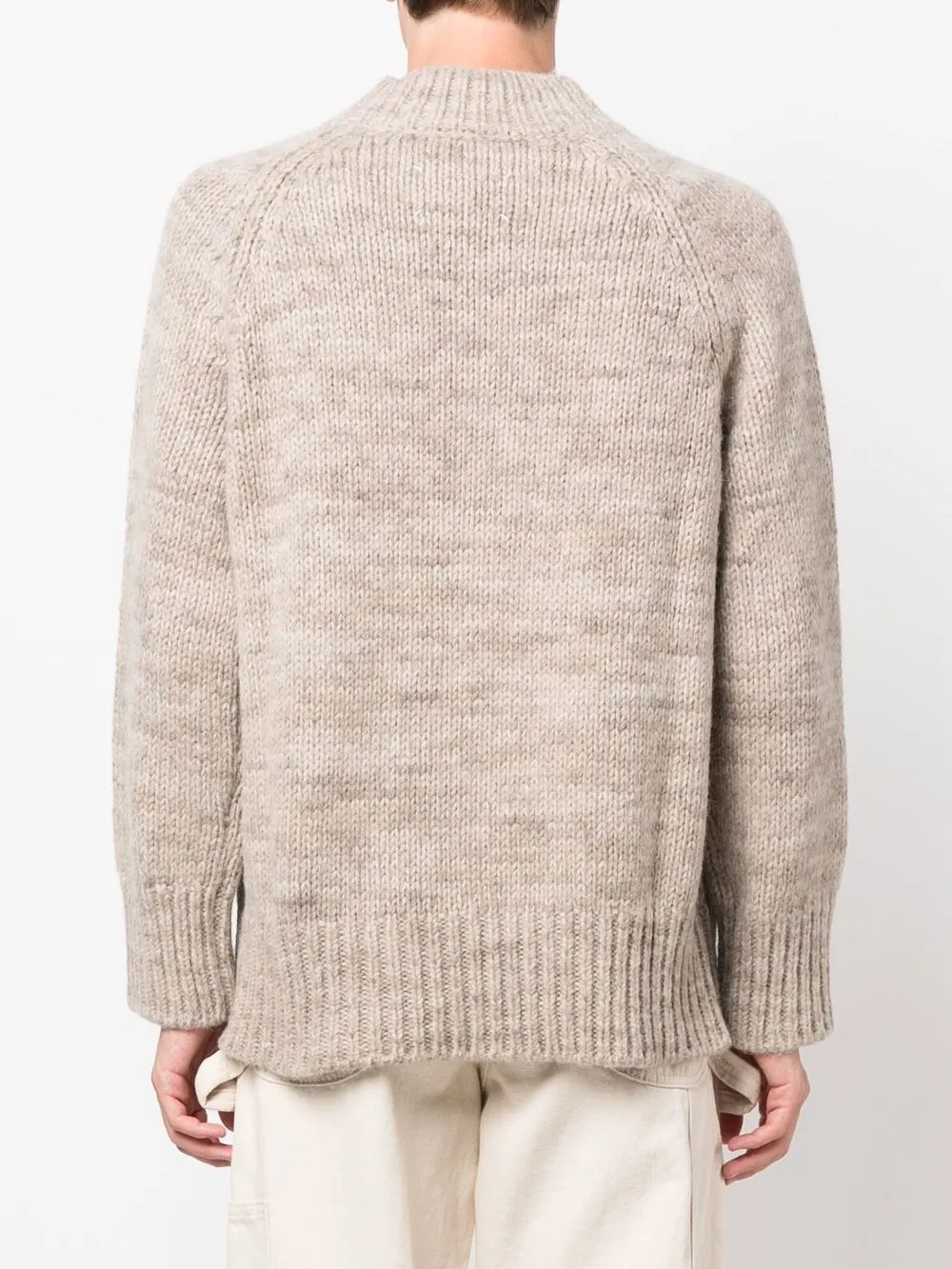 Светло-бежевый, смесовая шерсть альпаки, круглый вырез, длинные рукава, манжеты в рубчик, подол в рубчик, крупная вязка и нашивка с логотипом.