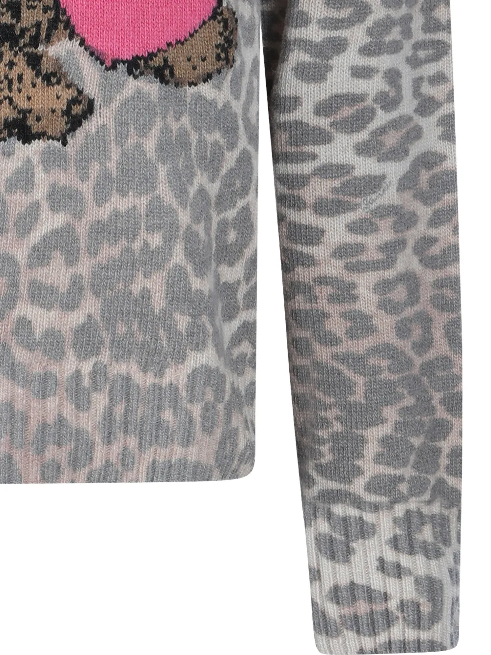 Коричневый свитер с леопардовым принтом, мотивом собаки, круглым вырезом, длинными рукавами и трикотажной ребристой отделкой