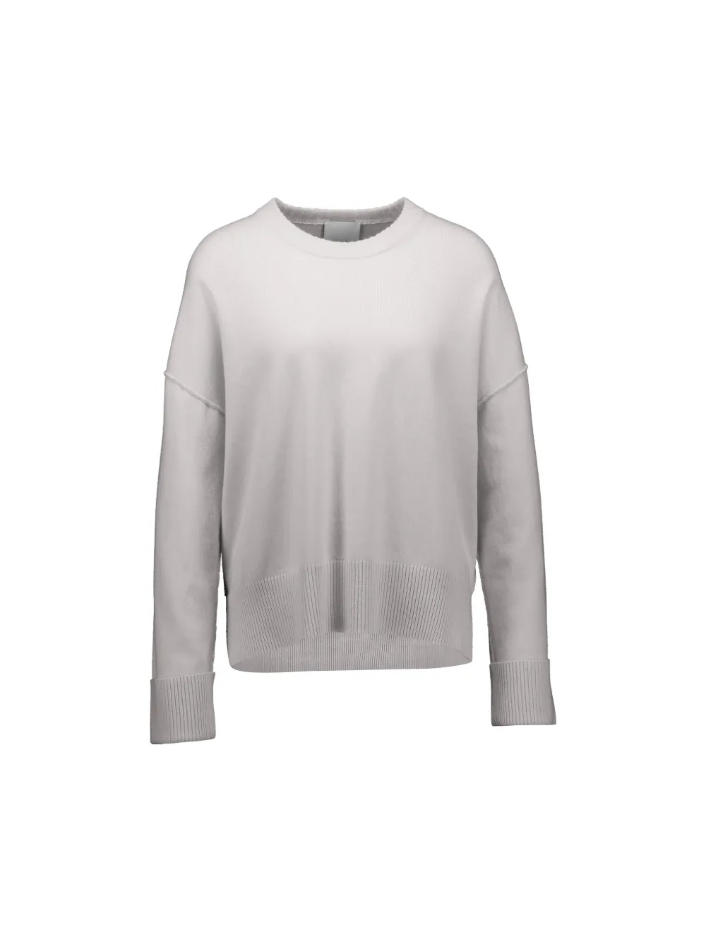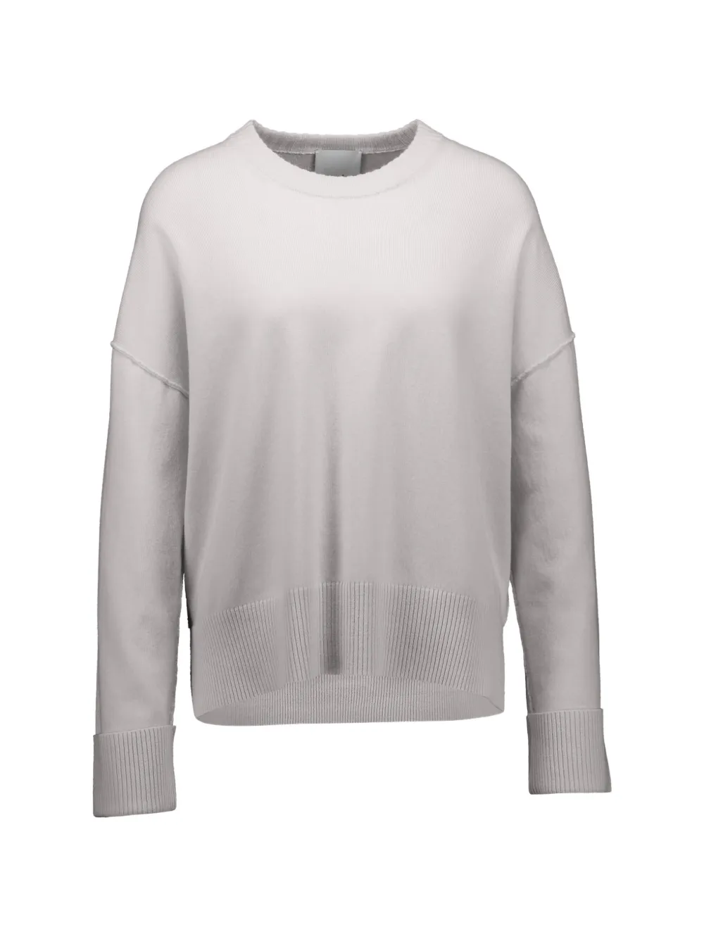 Светло-серый цвет, ребристый подол, открытые швы, круглый вырез, длинные рукава, ребристые манжеты