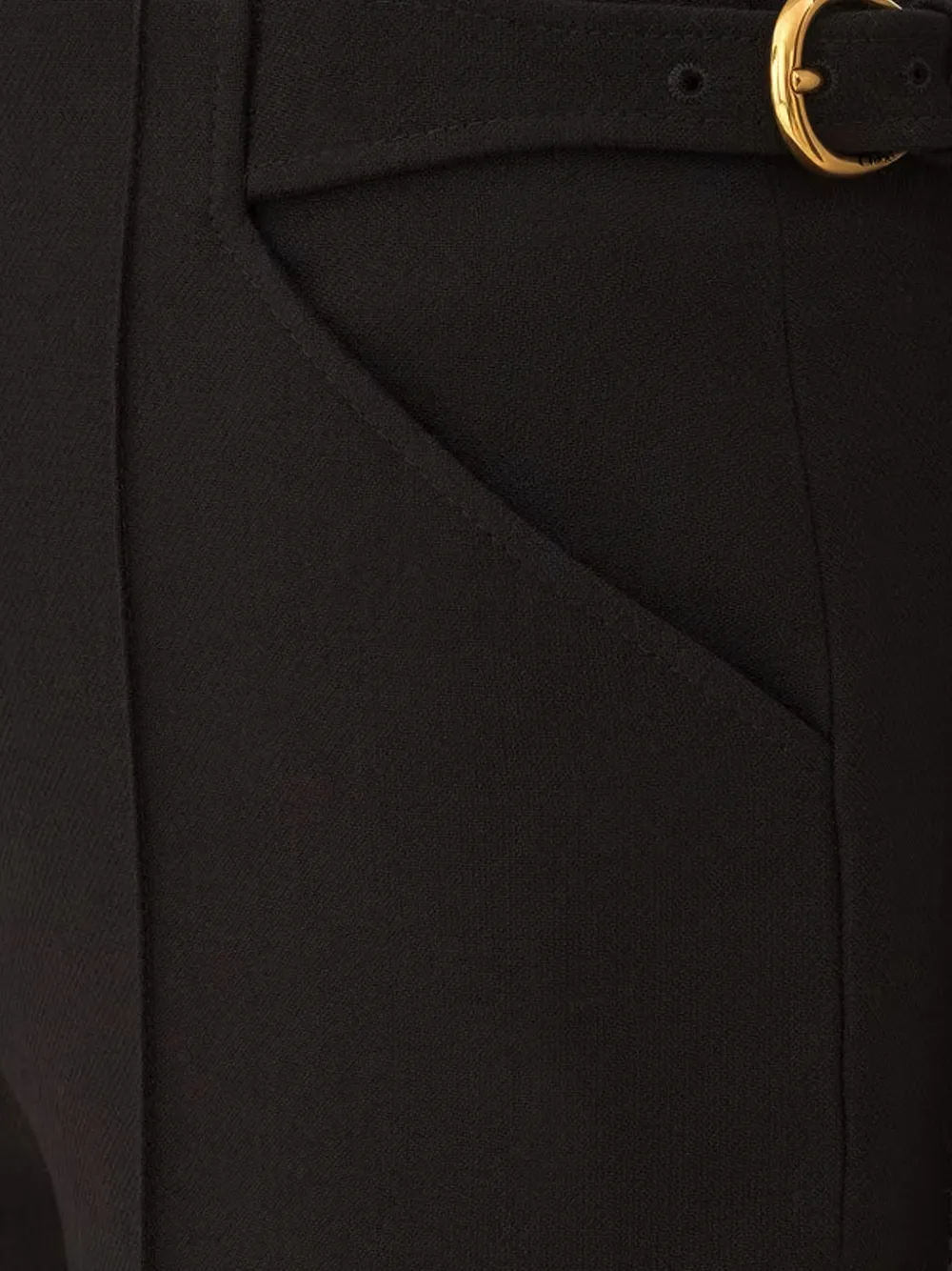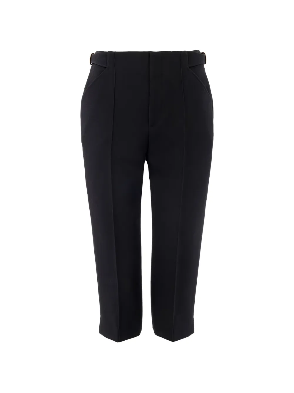 Черные регулируемые боковые хлястики, скрытая застежка на крючок и молнию, два боковых кармана, два задних кармана, стрелки, укороченные брюки