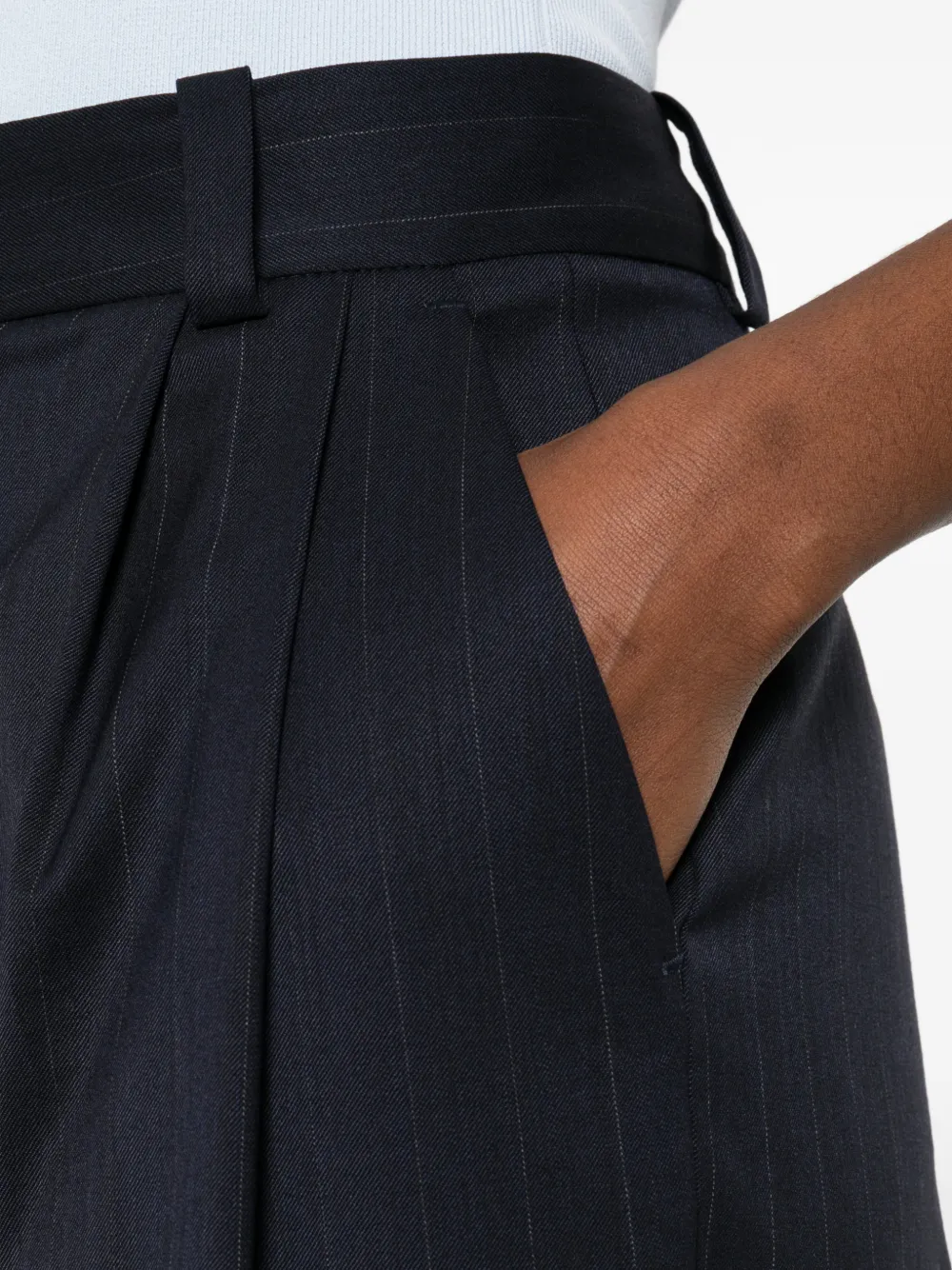 Темно-синий цвет, узор в тонкую полоску, шлевки для ремня, складки, боковые карманы