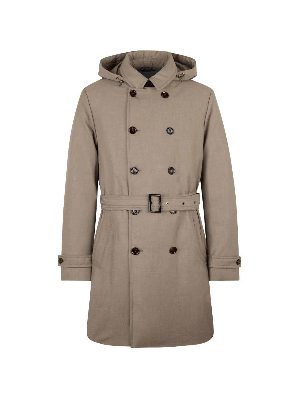 Бежевый двубортный плащ на пуговицах с поясом, капюшоном и манжетами на хлястиках