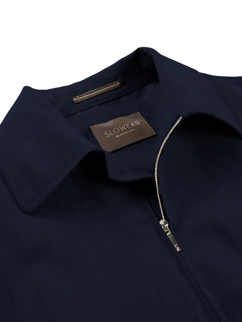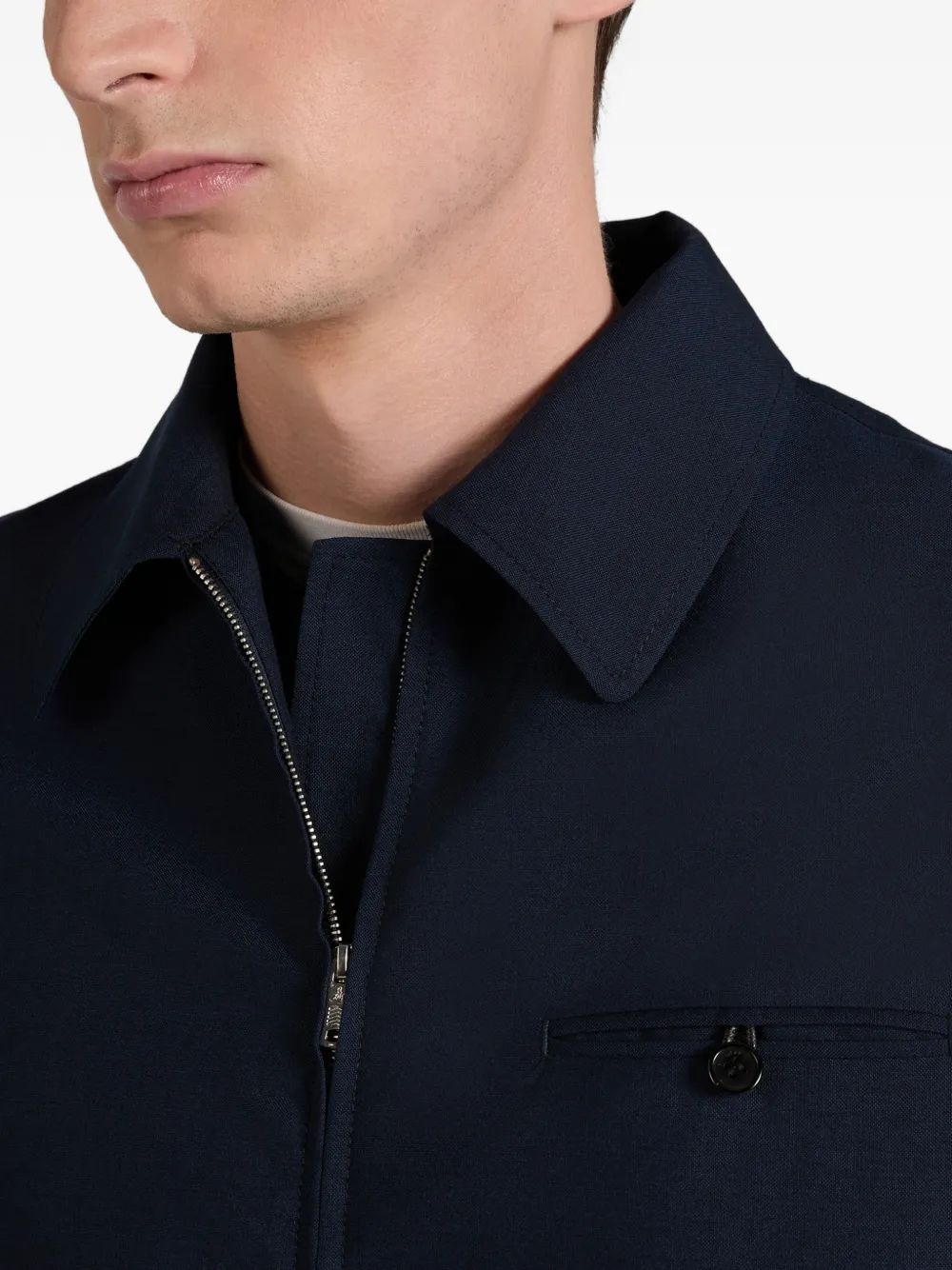 Темно-синяя шерсть мериноса, застежка-молния, воротник с острыми концами, нагрудный карман на пуговице, эластичный нижний край