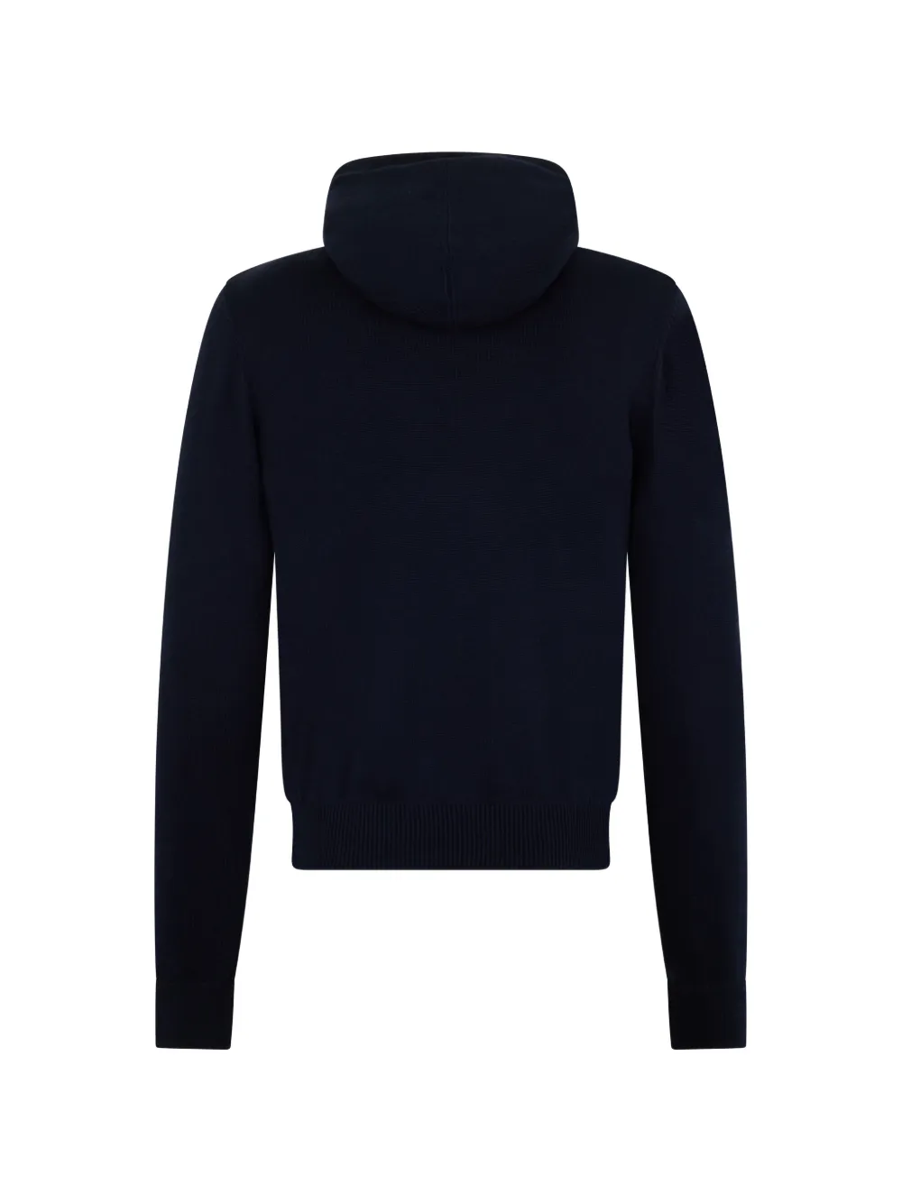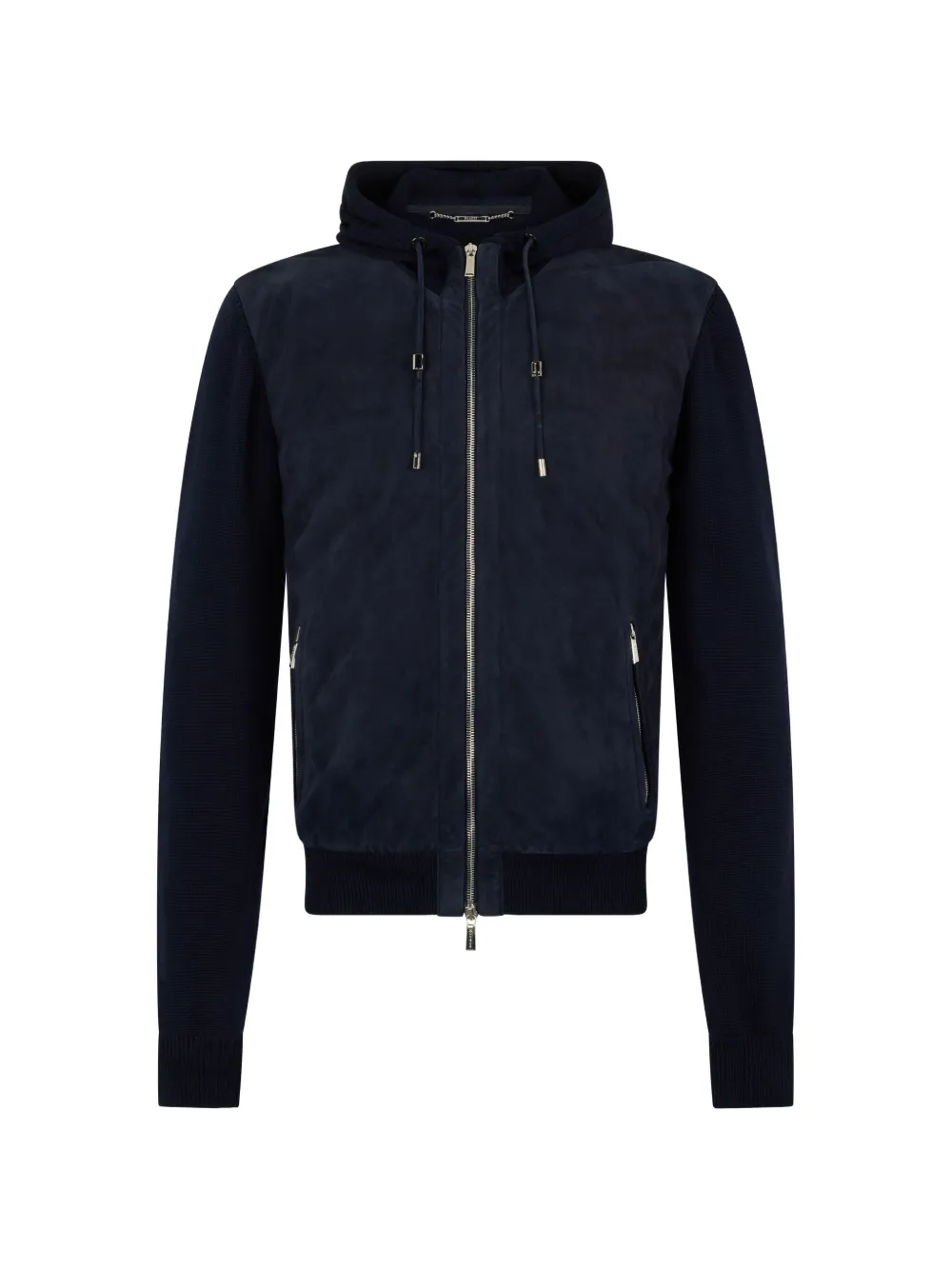 Синий цвет, вязаные (рубчатые) манжеты, капюшон, застежка-молния, боковые карманы на молнии, длинные рукава