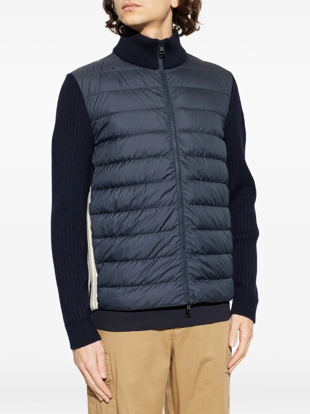 Темно-синий вязаный с ребристой фактурой, с простеганной передней частью, высокий воротник, застежка-молния, нашивка с логотипом