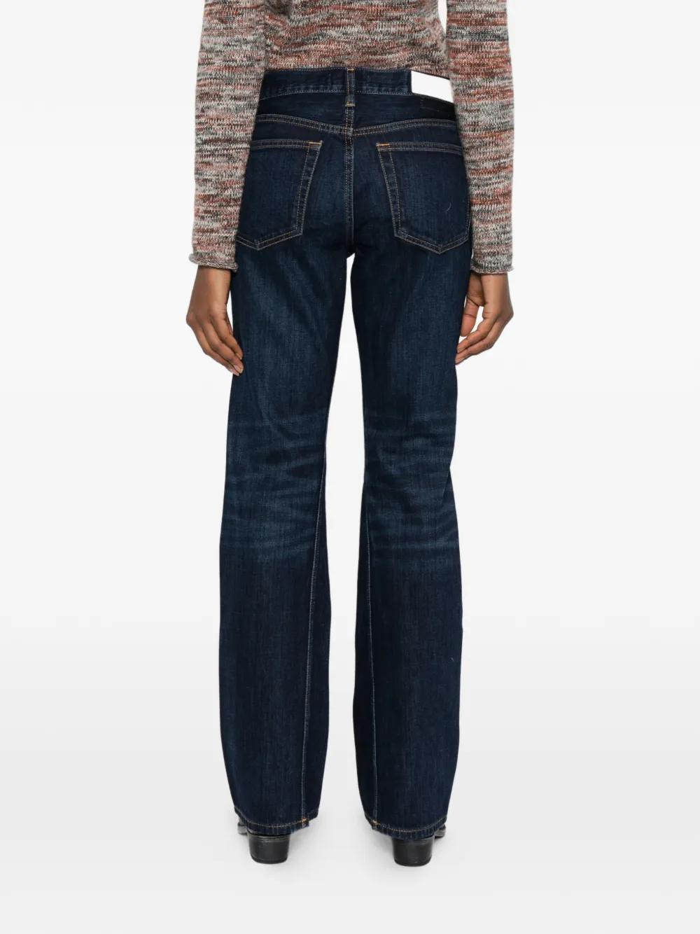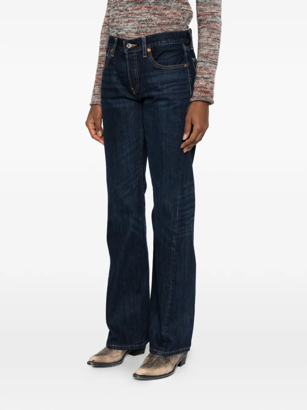 Темно-синие расклешенные джинсы с пятью карманами и шлевками для ремня