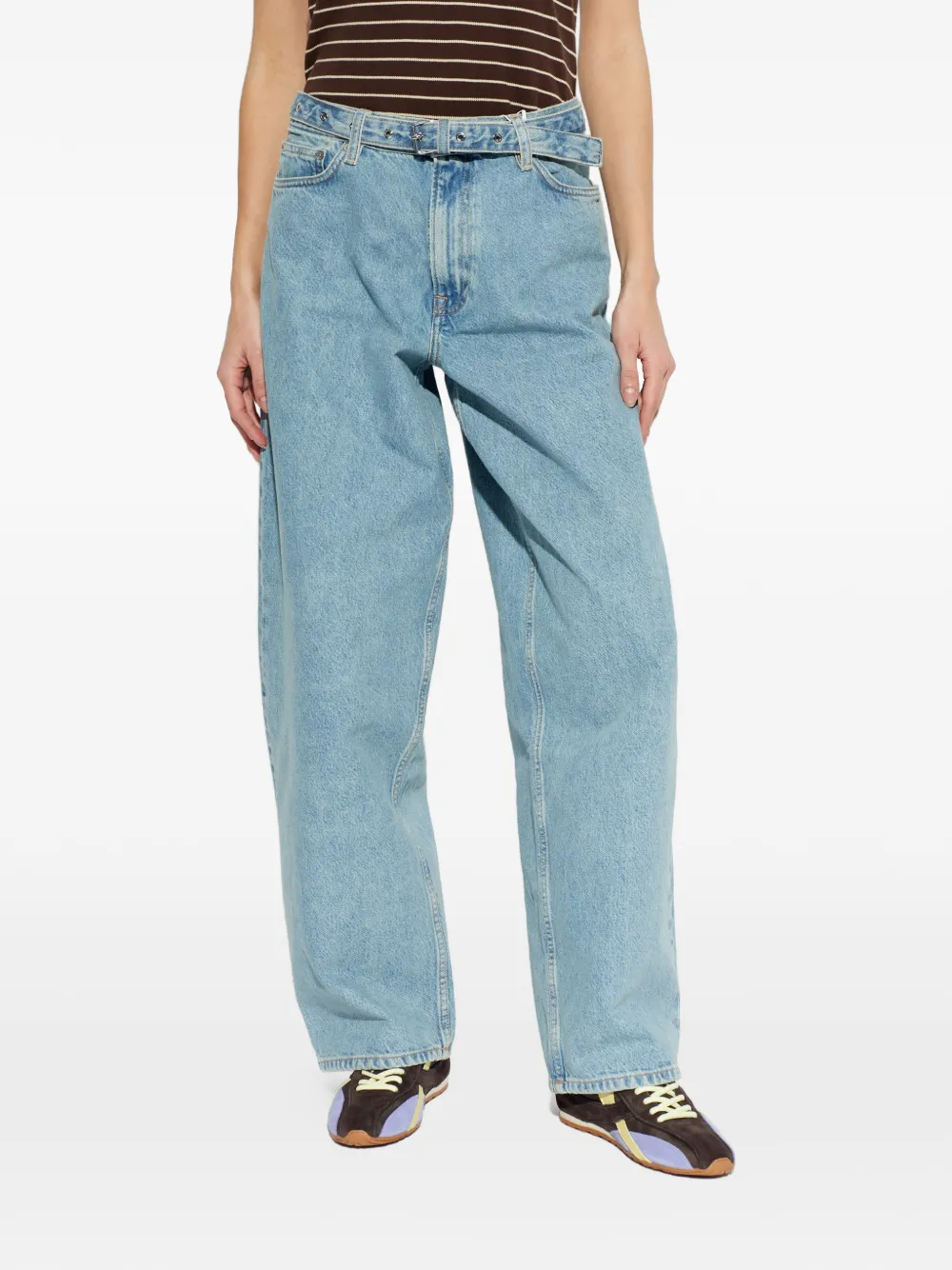 Синий ремень, швы с отделкой, пять карманов, широкие брюки свободного кроя
