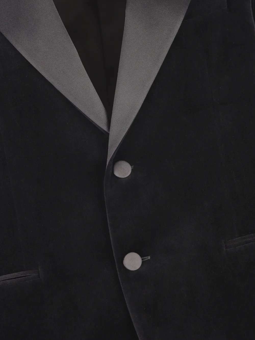 Черно-серый лацкан, застежка на пуговицы, длинные рукава, прорезной карман