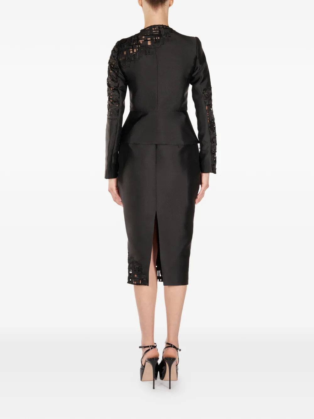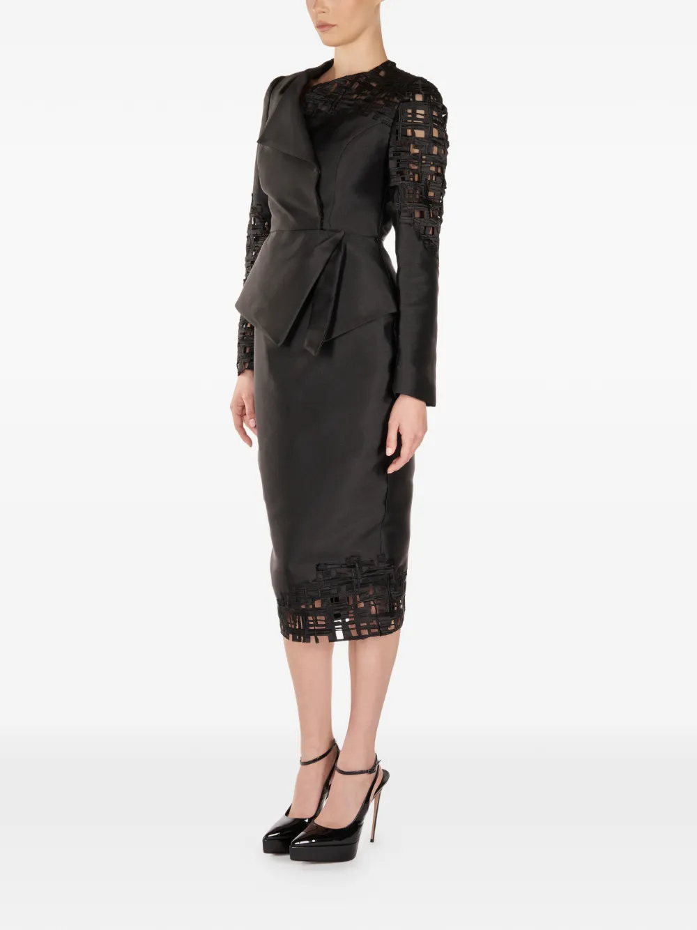 Черный цвет, вырезной дизайн, многослойная конструкция, асимметричные лацканы, талия с баской, разрез сзади