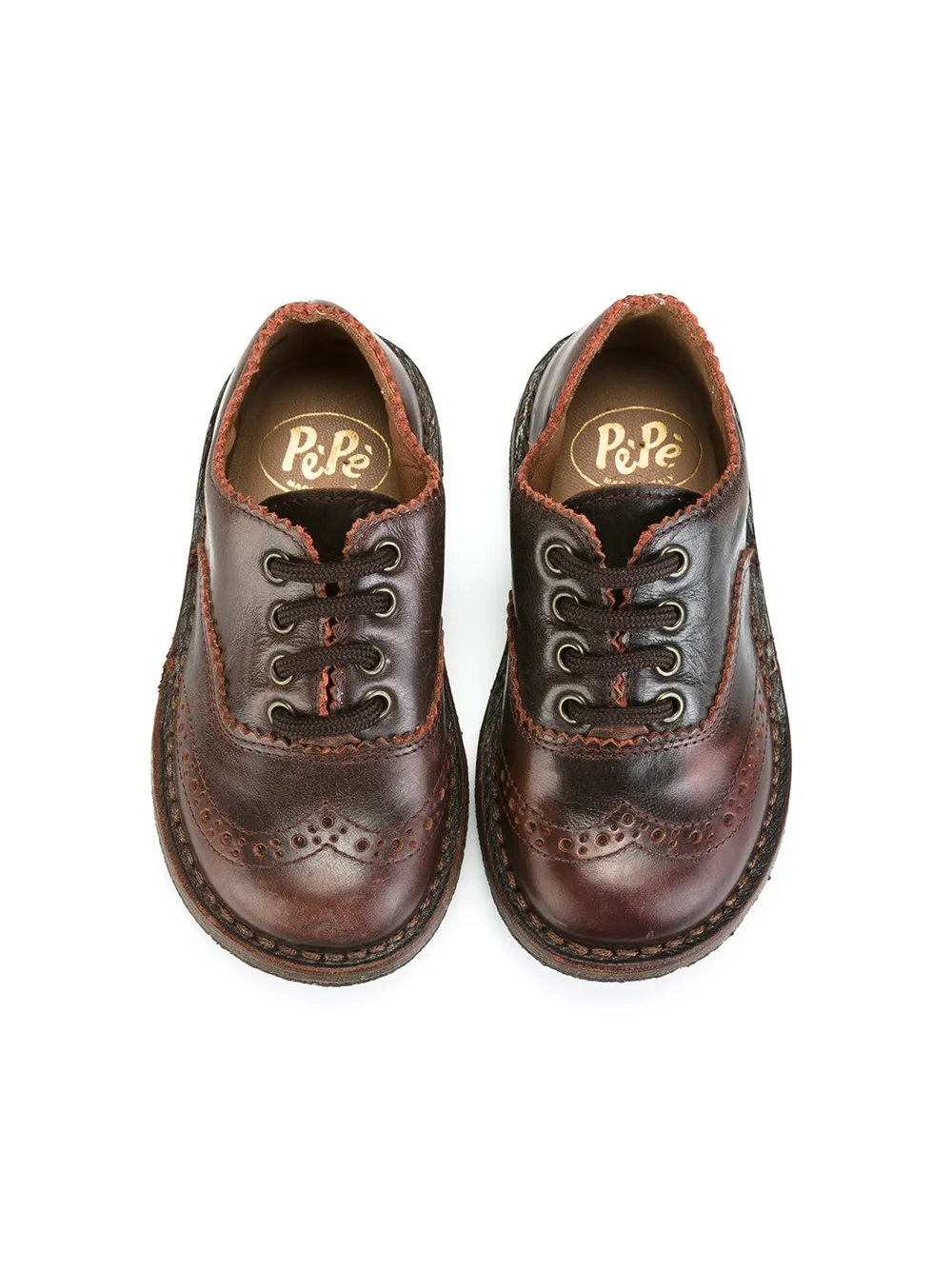 Коричневые кожаные туфли броги от Pèpè. Закругленный носок, шнуровка спереди, стилистика брогов, фирменная стелька.