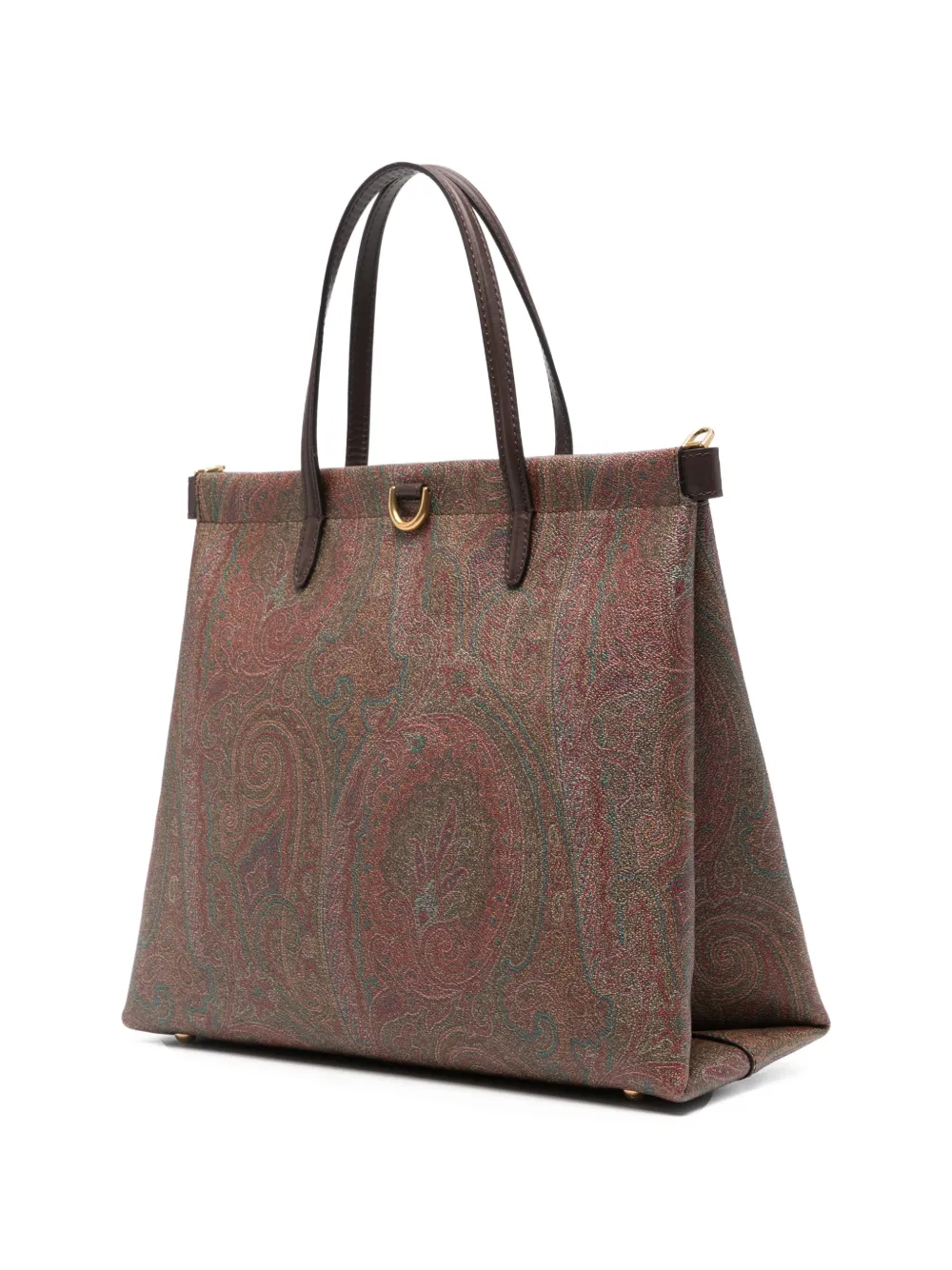 Коричневая сумка с узором «пейсли», верхние ручки, съемный регулируемый плечевой ремень, фурнитура золотистого цвета. В комплекте защитный чехол.