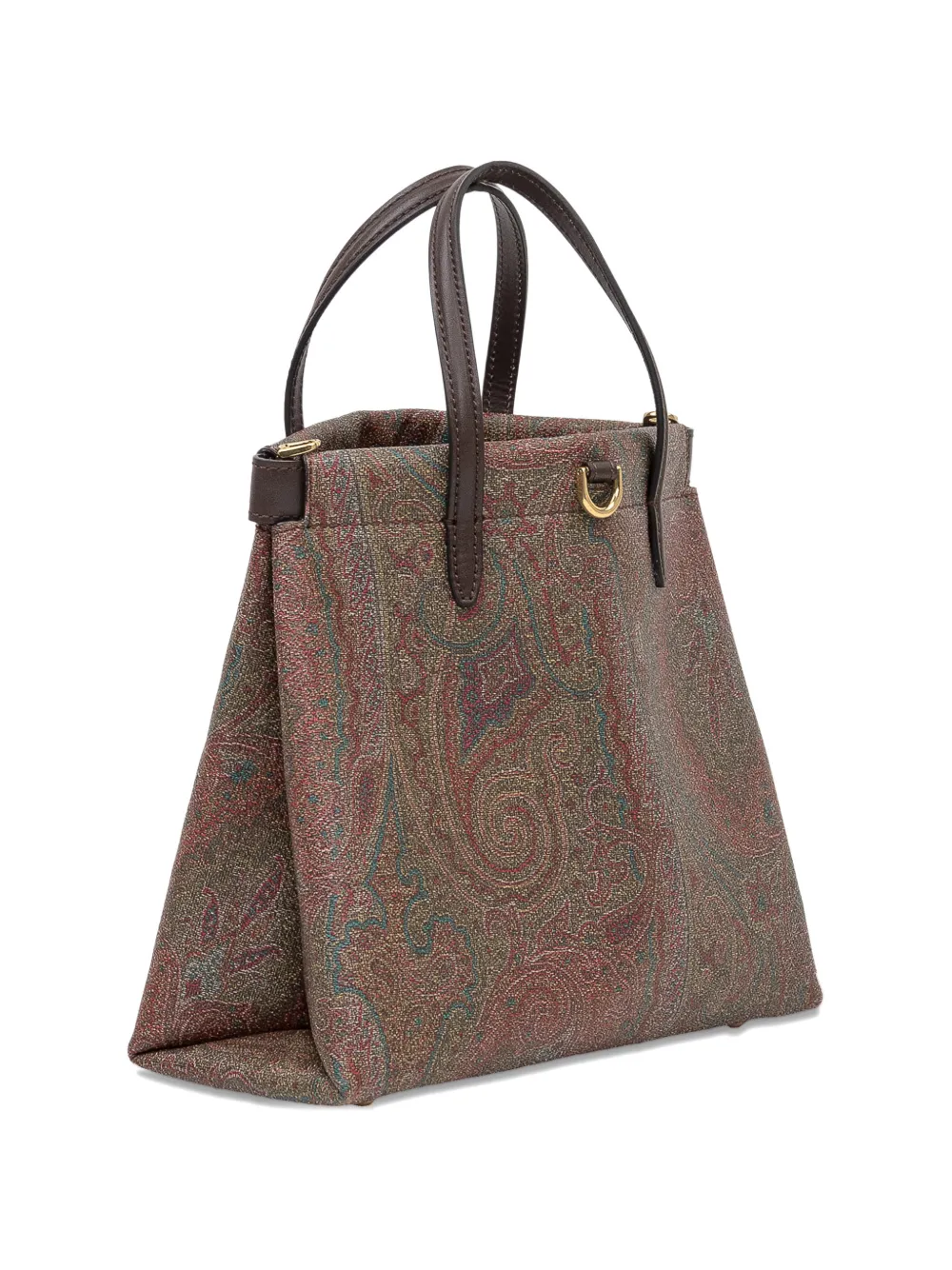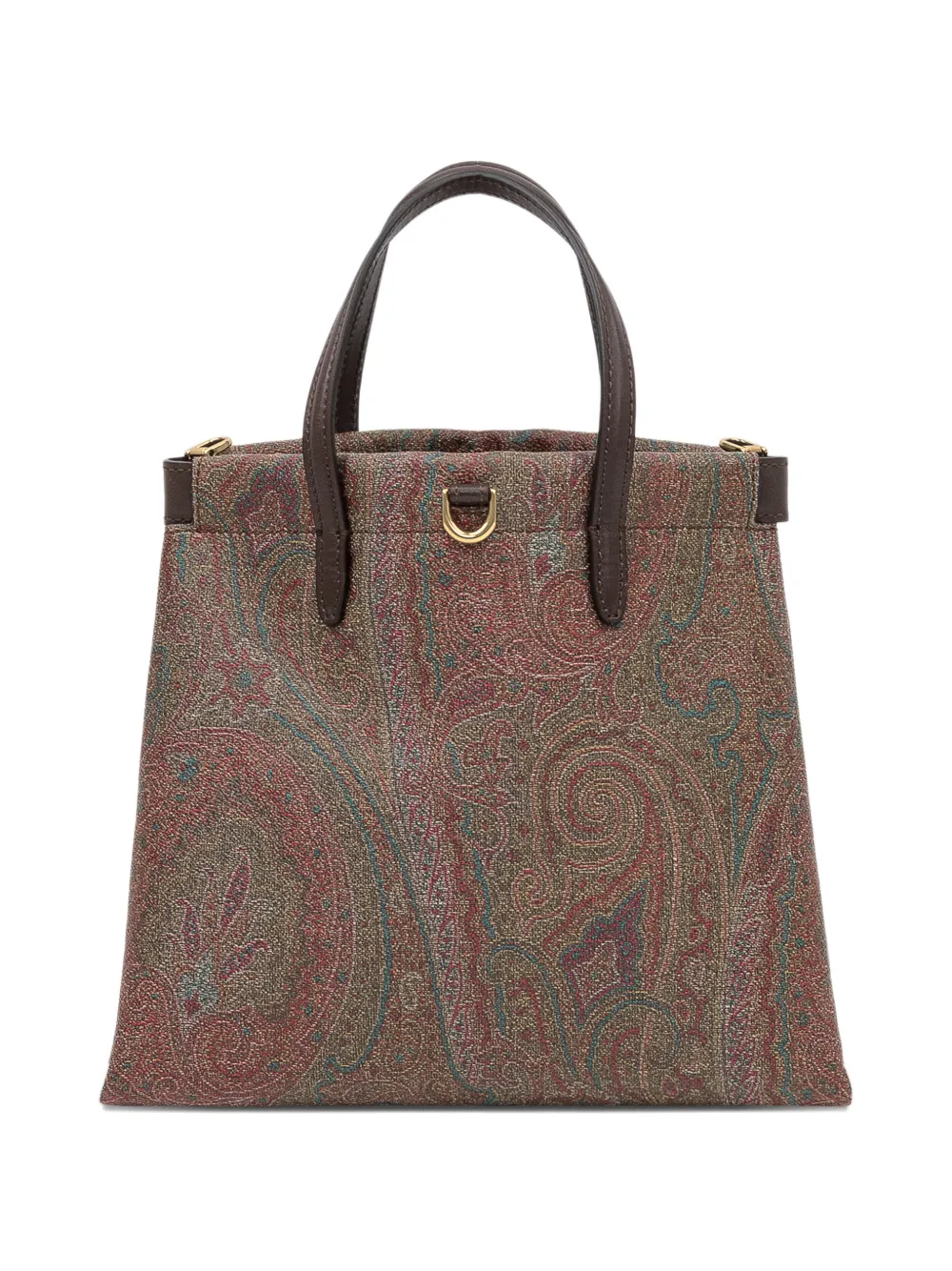 Коричневая сумка с рисунком "пейсли", верхние ручки, съемный плечевой ремень, фурнитура золотистого цвета, детали с d-образным кольцом