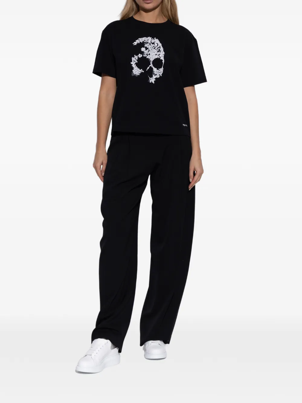 Белый цвет, украшенный каблук, застежка на шнуровке, круглый носок, платформенная подошва, перфорированные детали. Чтобы снизить воздействие на окружающую среду и уменьшить потребление хлопка, Alexander McQueen больше не будет предоставлять чехол для хранения с этими кроссовками.