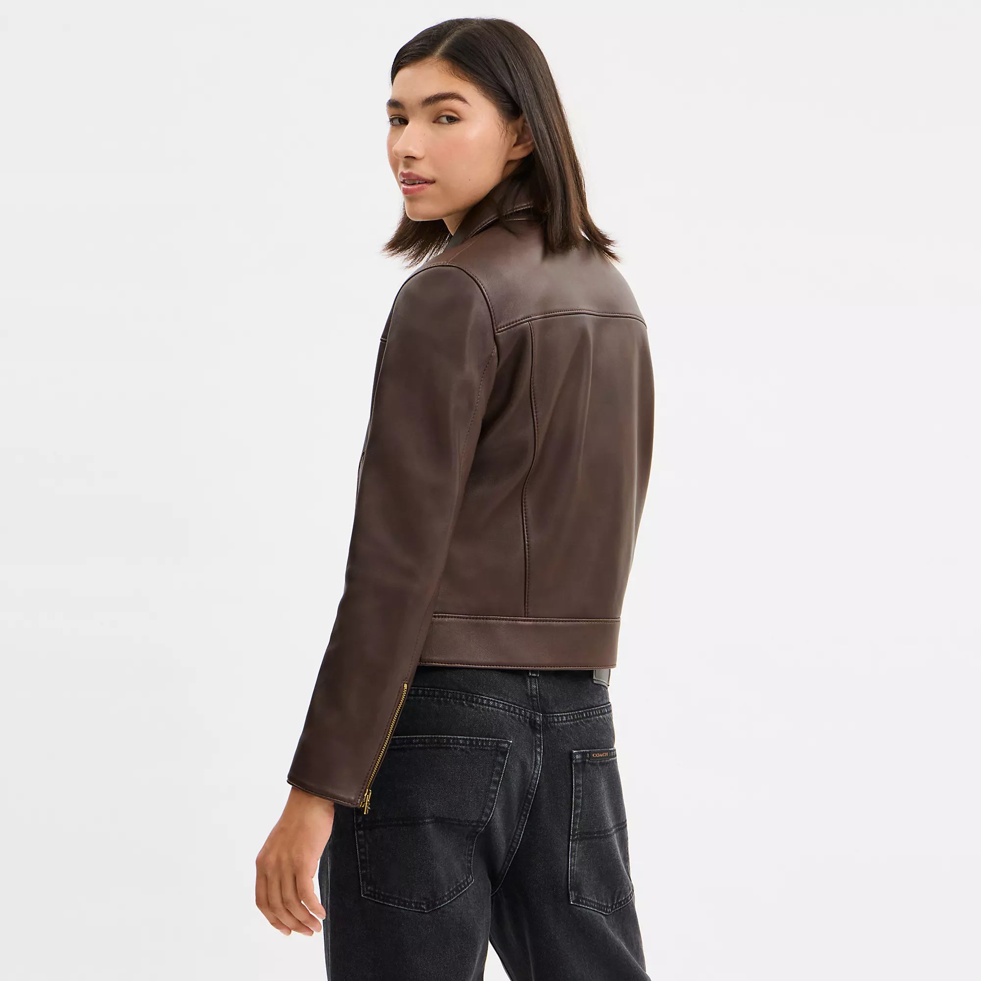 100% овечья кожа. Подкладка: 58% полиэстер, 42% вискоза. Застежка на молнию. Накладные карманы. Длина: 19 1/2 дюйма. Рост модели: 178 см, обхват груди: 79 см, обхват талии: 61 см, обхват бедер: 89 см. Размер: S. Кожаная куртка Coach Outlet - коричневая, размер: 2X-Small